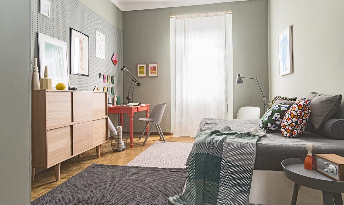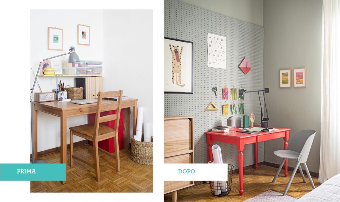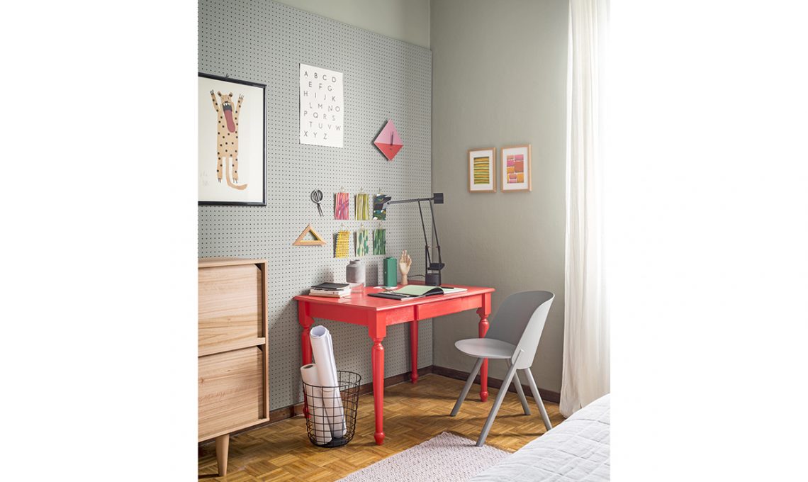 L'angolo studio dopo l'intervento delle nostre stylist. Il letto è stato girato di 90° così serve anche da divano. Madia Tillfälle [Ikea €299], il vecchio tavolo della cucina ridipinto in rosso con la sedia CH05 This [e15 €378,20] e la storica lampada Tizio [Artemide].