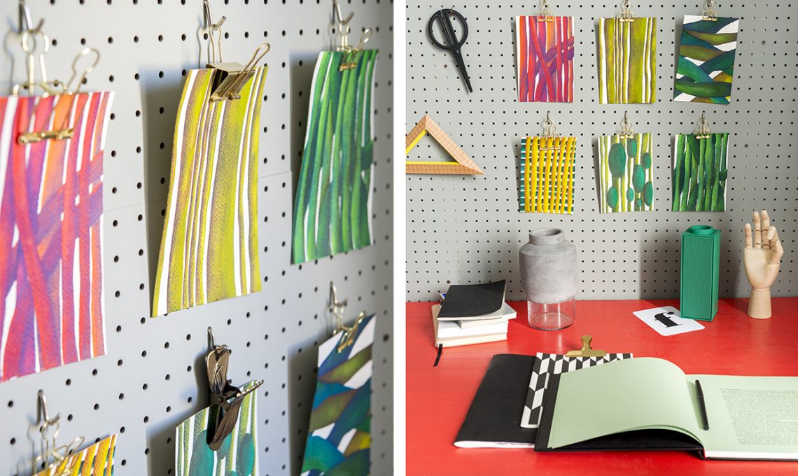 Nell’angolo office, i disegni della padrona di casa per i tessuti sono appesi al pegboard insieme alle forbici [Ikea] e alla squadra di [Hay] come la mano in legno.