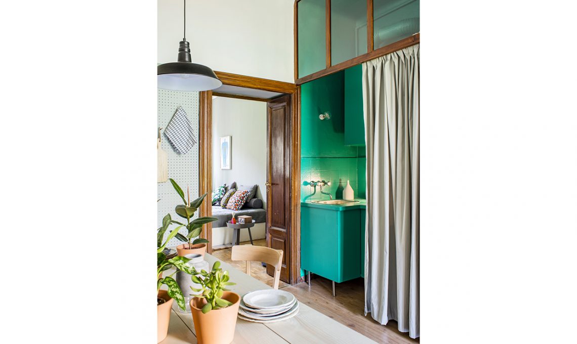 L’angolo accanto alla porta d’ingresso ospitava il frigo e un carrello in legno con le pentole: faceva disordine e non sfruttava bene lo spazio. Con una quinta in cartongesso Studiopepe ha creato una nicchia (chiusa da una tenda) che non solo è funzionale maarreda. Tocco décor, la cassettiera rossa.