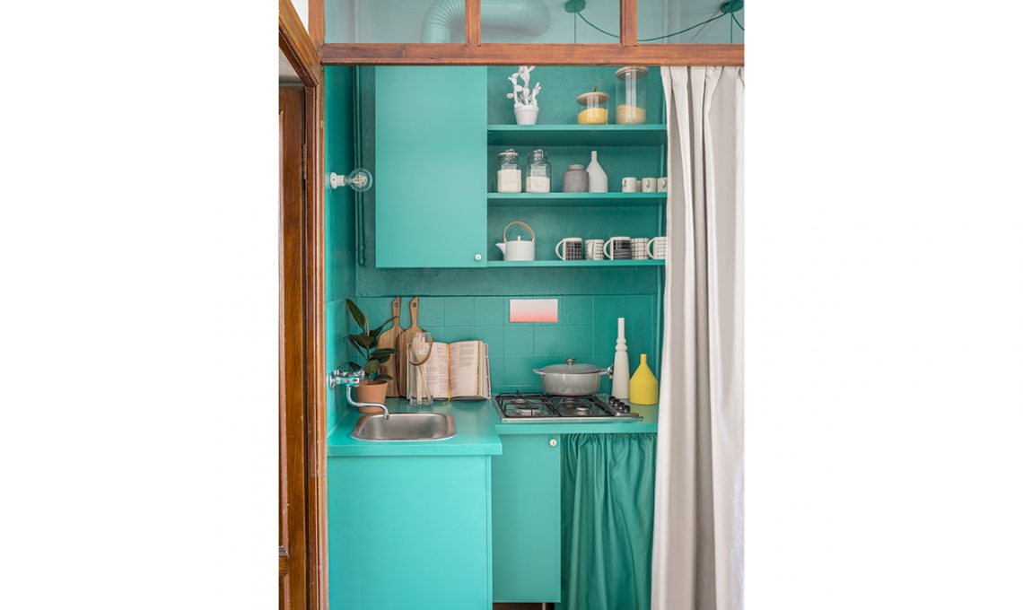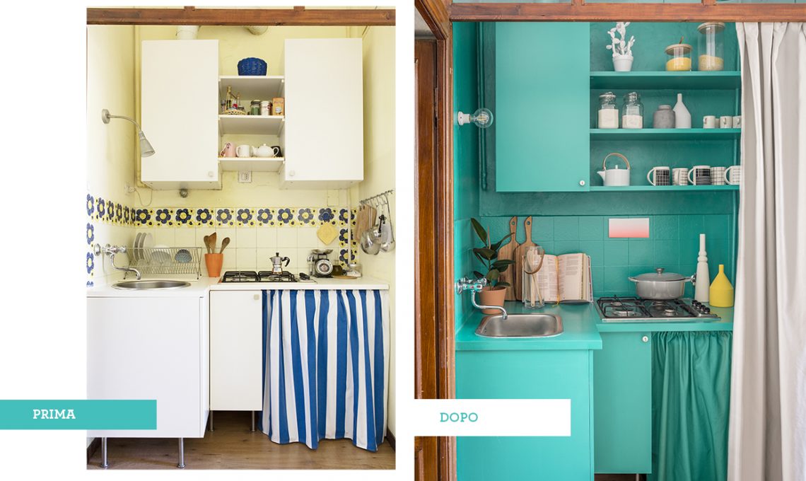 Tubi a vista e mobili non perfettamente a misura, ma in buone condizioni. Cosa fare? Per contenere i costi Studiopepe ha rinnovato pareti, basi e pensili con uno smalto per piastrelle resistente all’umidità.