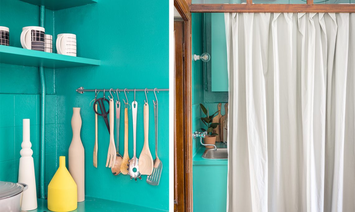Un colore forte e di carattere steso su ogni cosa (inclusi tubi e fili elettrici!) ha trasformato una cucina vecchia e un po’ triste in un angolo vivace e pieno di fascino!