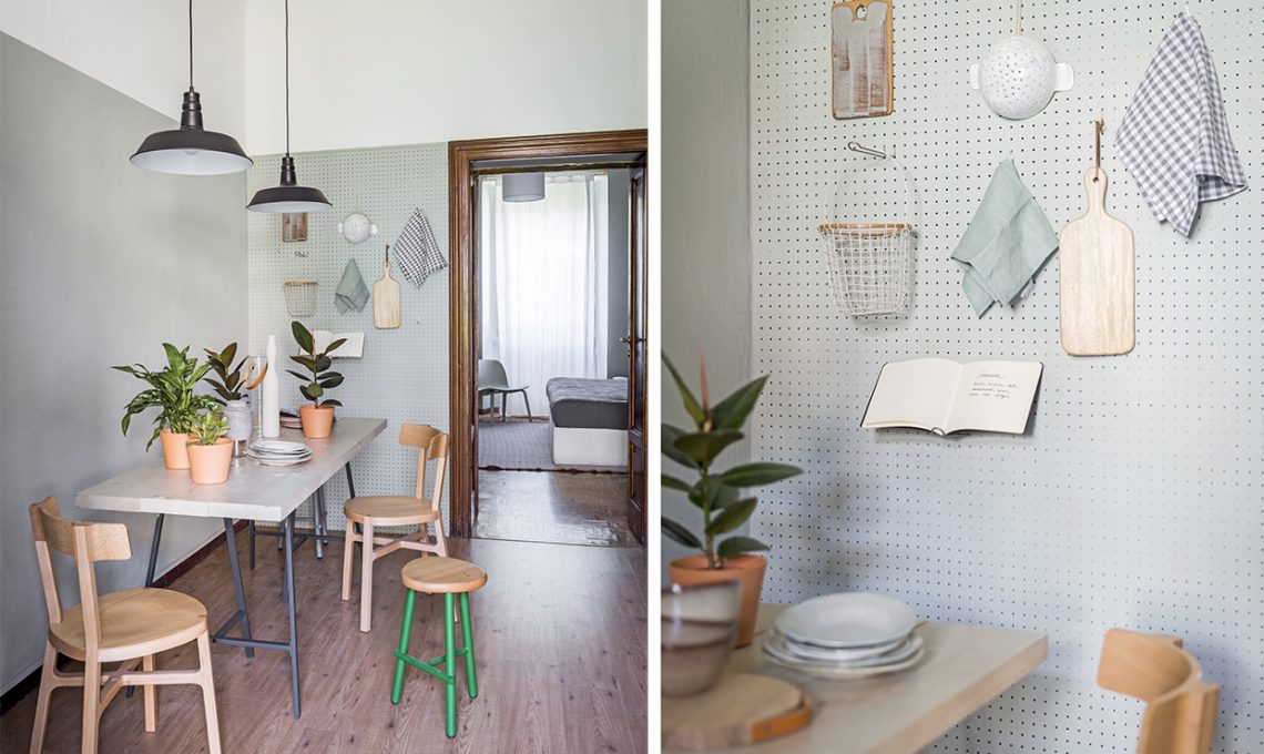 Il pegboard con cui è stata rivestita la parete è un pannello in legno, masonite o metallo con fori equidistanti su tutta la superficie, in cui è possibile inserire pioli e ganci. Per mascherarlo, basta dipingerlo nel colore della parete.