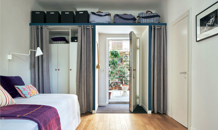 Cerchi un modo per rendere ‘invisibile’ l’armadio? Separa i vari moduli e dipingili con la stessa vernice della parete [Sikkens J9.07.73], crea una soluzione a ponte attorno alla porta aggiungendo, in alto, delle scaffalature con elementi Ivar di [Ikea].