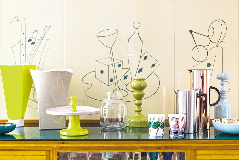 Sul mobile buffet, da sinistra vasi Loft Veneziano e Loft Orfeo di Bosa come l’alzata, le ciotole e i candelabri; vaso trasparente Silent Vase [Muuto €35], mug con decoro old style [Magazzini Associati €65 il set da 3], caffettiera e thermos [Stelton].