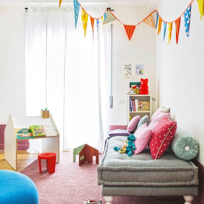 Sul sommier formato dalla panchetta Adam con materasso trapuntato a mano [cm 80x190 €1.780], plaid in lana merinos [cm 130x180 €221] e cuscini vari [da €55 cad] tutto Twils. Orsetti tricot e pupazzi su » yellowbasket.it come le bandierine Ms. Fox [m 11 €39,50] e lo sgabello Drum [€79]. Pouf turchese Party [Casamania, Ø cm 60x36h €528] e tappeto Rita [Kasthall, cm 200x300 €3.257].