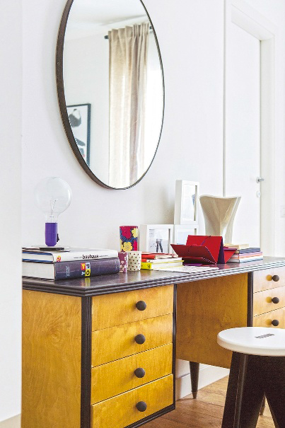 Tra la porta della camera e quella del bagno padronale privato c’è la toeletta Forties di famiglia (abbinata al letto). Sul top, luce da tavolo Lampadina in alluminio [Flos €84], oggetti di cartoleria [Fabriano Boutique], cornici Ribba [Ikea] e vaso in ceramica [Bosa]. Sgabello bianco e nero della serie Plus & Minus disegnato da Francesca [Less is More Design].