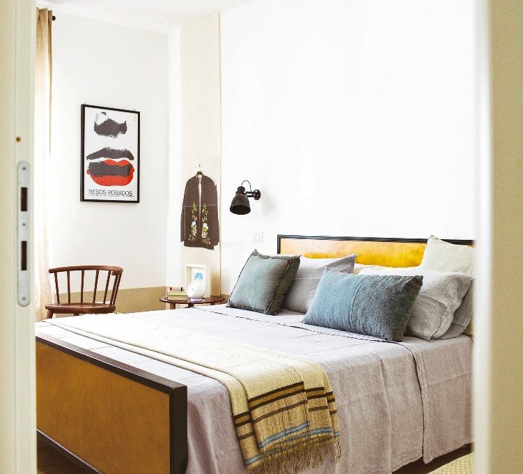 Il letto Anni ’40 di famiglia è vestito con lenzuola in lino grigio [La Fabbrica del Lino da Magazzini Associati €178 cad il lenzuolo sotto e il lenzuolo sopra, €52 la federa da cm 50x50 e €83 quella da cm 80x50] e il plaid Paul [Twils, cm 160x200 €282]. Sedia a dondolo W. 608 [Billiani, cm 49x59,4x72,4h €357], comodino Fergana [Magazzini Associati, Ø cm 50x45h €810] con sveglia [Diamantini & Domeniconi €93]; carta da parati trompe-l’œil con sedia e giacca [Deborah Bowness in vendita da Mia Via di Ripetta, cm 60x300h €240].