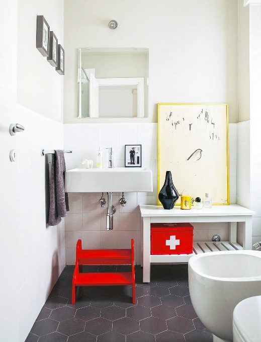 Sulle pareti sono posate piastrelle in monocottura Diamante bianco lucido [Tonalite, cm 15x15 prezzo dal rivenditore] a contrasto con quelle esagonali nere Hex del pavimento [Etruria, cm 15x17 €87,83/mq]. Sanitari a terra serie 500 [€417 il vaso, €291 il bidet] e lavabo sospeso Rettangolo [cm 60x48,4x14,5h €138] tutto Pozzi Ginori. Panca bianca Hemnes [cm 83x37x53h €64,90] e scaletta rossa Trogen [cm 40x40x33h €17,99] di Ikea. Scatola per medicine [c.u.c.i.n.a.] e fotografie in cornice della proprietaria.