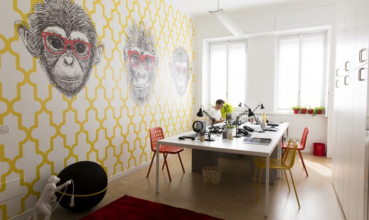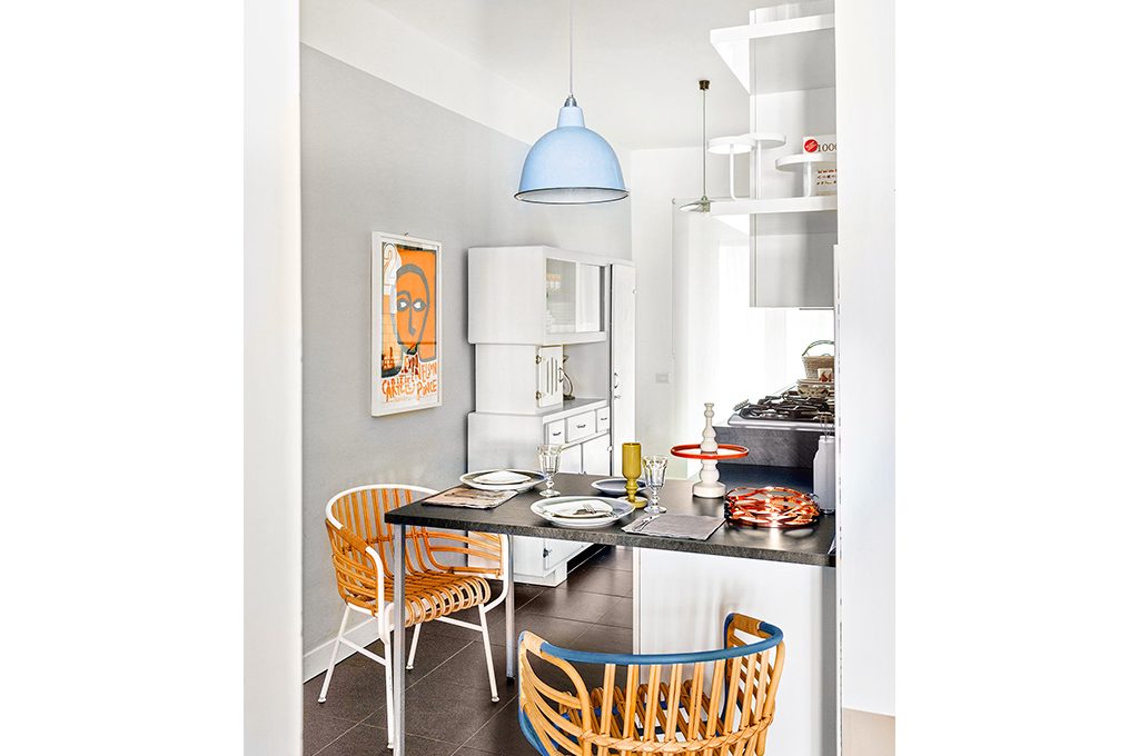 Partendo dall’esistente (piastrelle esagonali nere, sgabelli disegnati da Francesca) e dai libri di Laura, Cristina ha deciso di proporre mobili d’impatto grafico più finiture tattili e colorate che ben spiccano sul bianco luminoso di arredi fissi e pareti.