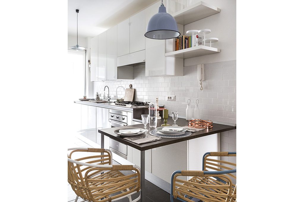 La penisola snack è servita da 2 sedie Raphia [Casamania, cm 55x53x75h da €592 cad], illuminata da una lampada industriale azzurra e apparecchiata con piatti [Magazzini Associati], bicchieri [c.u.c.i.n.a.], tovaglioli [La Fabbrica del Lino], vassoio [Stelton] e ceramiche [Bosa]. Sullo sfondo, la credenza Anni ‘50 di Laura restaurata e rilaccata in bianco.