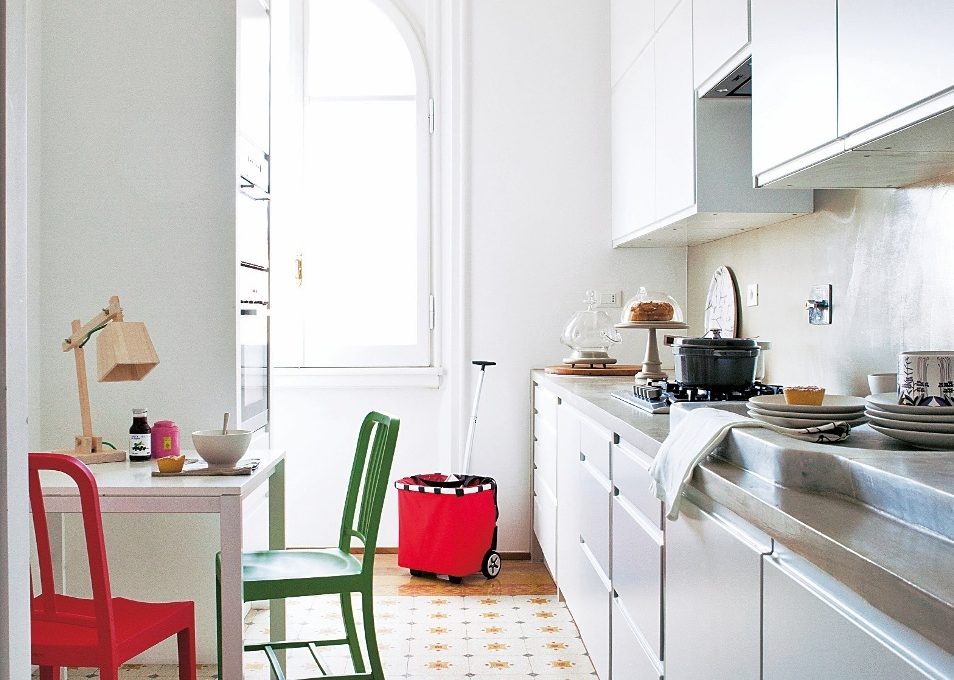Con i pezzi ‘giusti’, la cucina ha acquistato vivacità. E per esaltare la tanta luce che entra dalla finestra, anche le luci all’interno sono ben studiate: in alto c’è una coppia di faretti alogeni direzionabili. Per illuminare il piccolo tavolo, sul lato cieco del cubo, l’idea insolita da rubare, è la lampada in legno da scrivania: qui dà atmosfera per le cene a due.