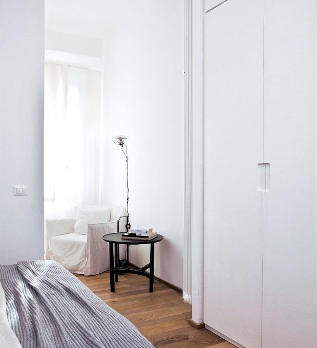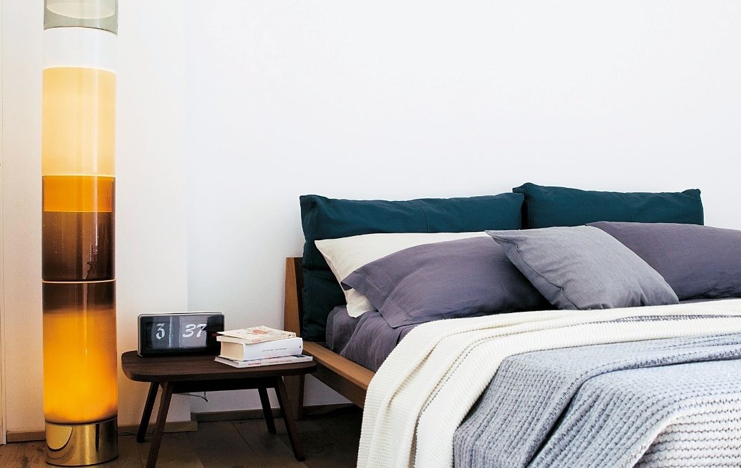 Il tavolino che fa da comodino, il totem luminoso e il letto minimale spiccano tra il noce nazionale e il bianco. Sono tutti di design recente, ma del filone che si rifà ai decenni cult, tra 1940 e 1970. Puoi ispirarti al mood anche cercando ai mercatini.