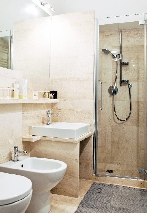 Una chicca di bagno... Piccolo e tutto rivestito con pietra sarda rosata, apprezzata per le inclusioni fossili, come le spirali di Nautilus. La superficie calcarea naturale smussa le linee squadrate, la base del lavabo richiama perfino l’essenzialità di un lavatoio: davvero un bel contrasto con la doccia hi-tech!