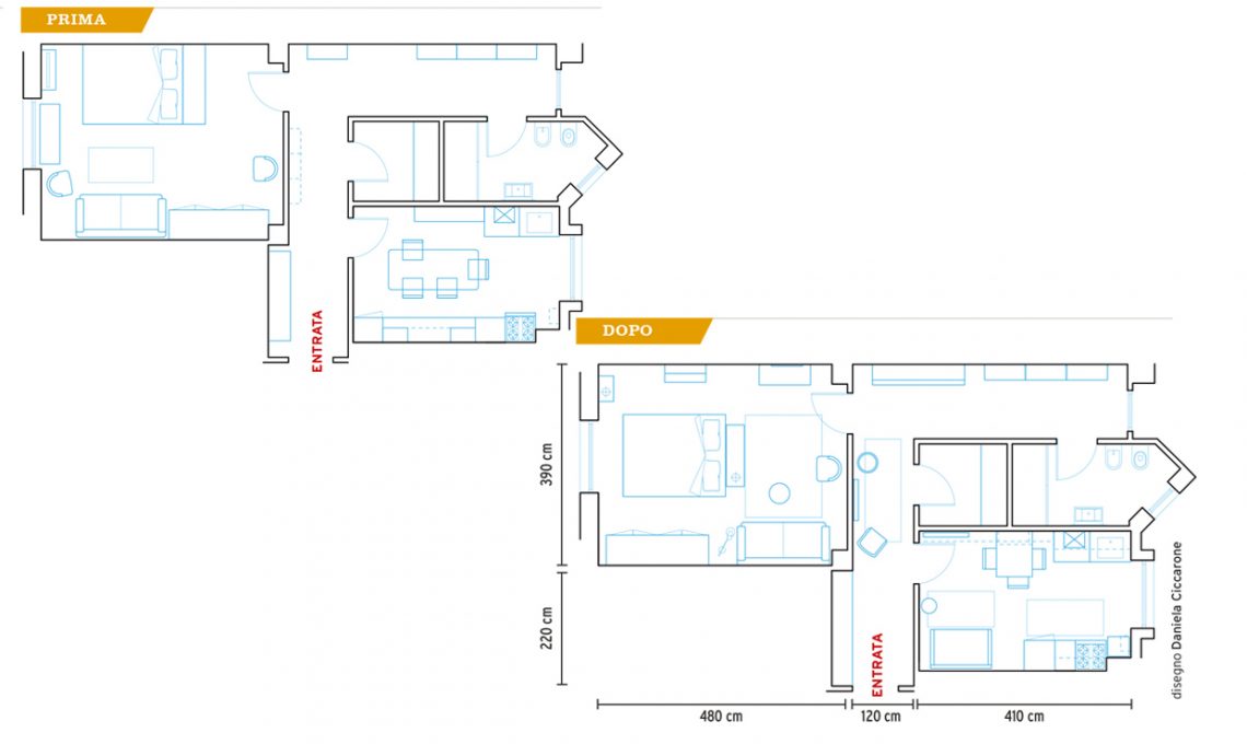 Di fronte, sostituiti i vecchi mobili, si è liberato il posto per un divano!