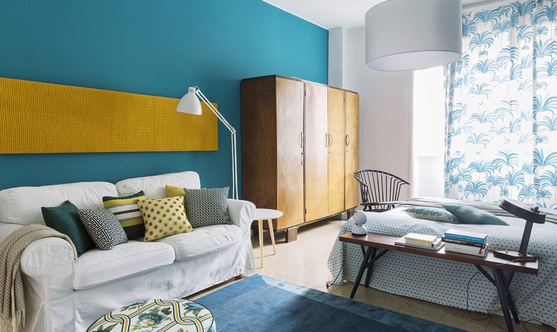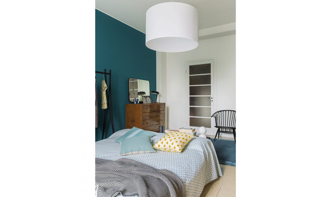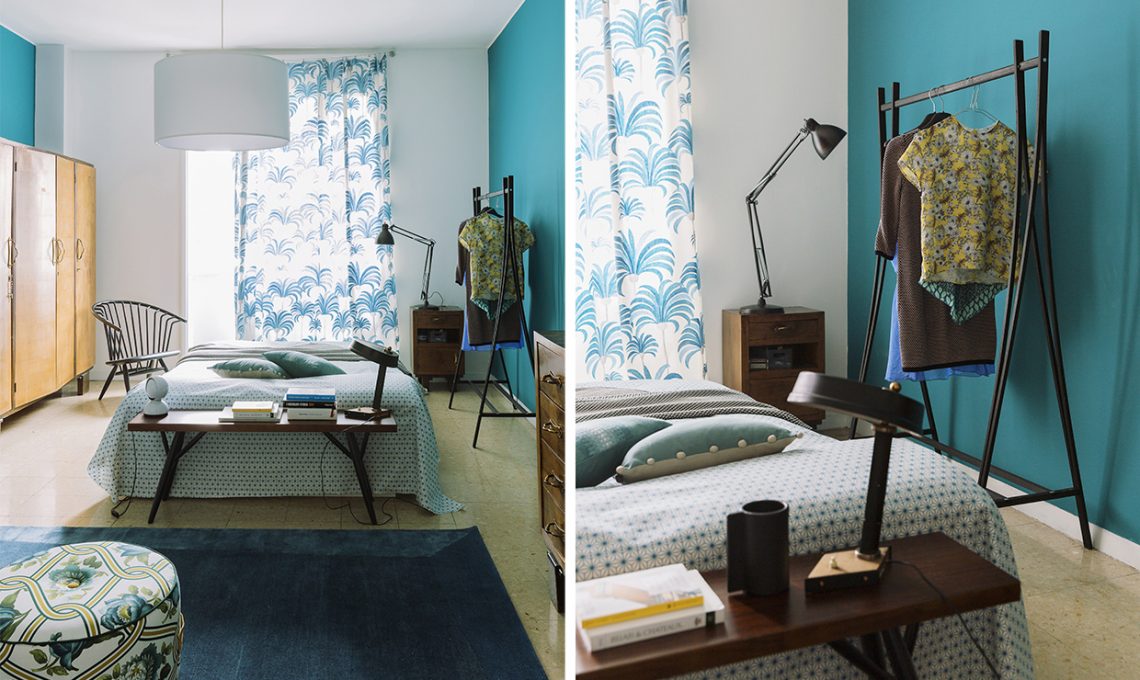 Gli abbinamenti di colore sono una parte fondamentale del décor. Una volta individuata la tonalità che ti piace (in queso caso era il blu pavone usato per le pareti della camera) puoi giocare con accostamenti in nuance o a contrasto. Gli interior designer si basano su regole precise. Per non sbagliare e avere spunti nuovi, puoi andare sul sito https://color.adobe.com, utile e intuitivo. E poi puoi usare pattern diversi, come ha fatto Vanessa Pisk, che ha mischiato fantasie romantiche e linee geometriche. L’effetto? Sofisticato e personale.