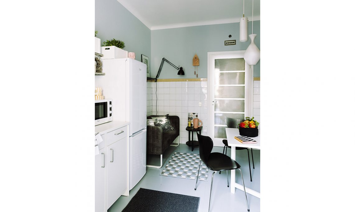 Sul tavolino [Zilio A&C], caraffa [Jannelli & Volpi]. Lampada [Leucos, €209,84] orologio a cucù [Progetti]. Tappetini: grigio [Ikea] e in plastica [Pappelina]. Pareti dipinte con pittura [Lechler].