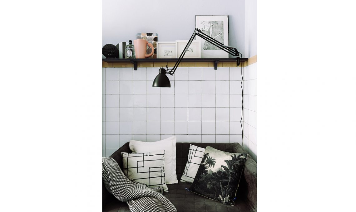 Ti servirebbe una lampada, ma hai poco spazio? Fissane una a pinza, e con braccio orientabile, a una mensola. Sul divano Knopparp [Ikea, cm 119x76 €79,99], cuscini [Hk living da Jannelli & Volpi] e rivestiti con tessuto [Kirkby Design].