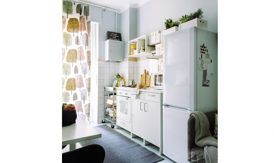 Sul carrello in acciaio inox Grundtal [Ikea, cm 54x41x90h, €129], bilancia verde (bella anche come portafrutta!) da [Jannelli & Volpi]. Taglieri in legno [Delamont] e, sul piano di cucina [Ikea], il cappuccinatore Aeroccino, di [Nespresso] come la mug. Le aromatiche in cucina sono utili e decorative. Se hai poco spazio puoi appenderle con un portavasi pensile (li trovi su Etsy, da Bloomingville, o puoi realizzarlo da sola, all’uncinetto).
