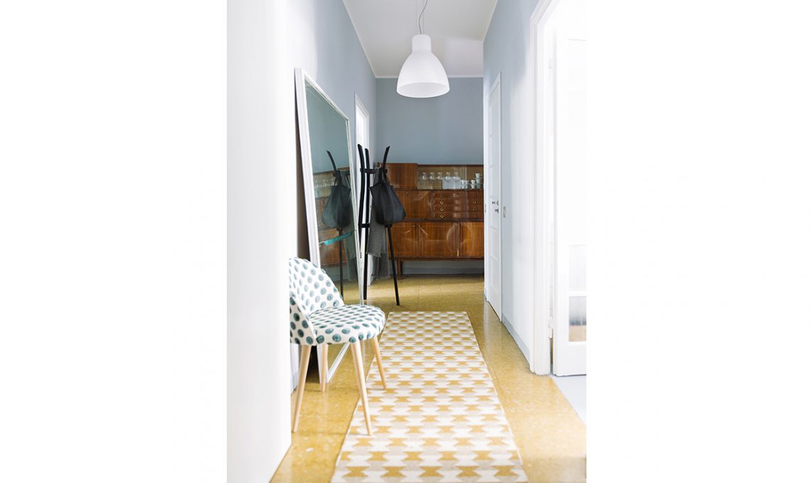 Sedia rivestita con tessuto di [Brochier], passatoia in plastica [Pappelina] tono su tono con il pavimento, lampada a sospensione [Leucos], appendiabiti Leek [Zilio A&C].