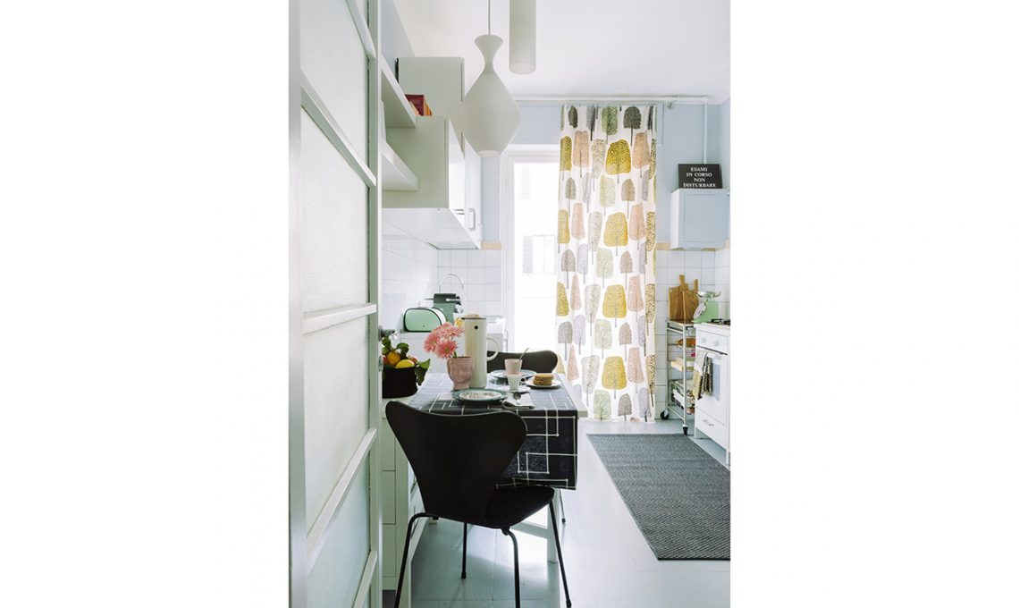L’intervento sulla cucina è stato drastico: via i vecchi arredi e niente pensili, ma ripiani su cui Romina può tenere a vista i cibi che ama e usa di più. Il nuovo tavolo, ora addossato a una parete, è conviviale e salvaspazio: a ribalta, ospita da 2 a 4 posti.