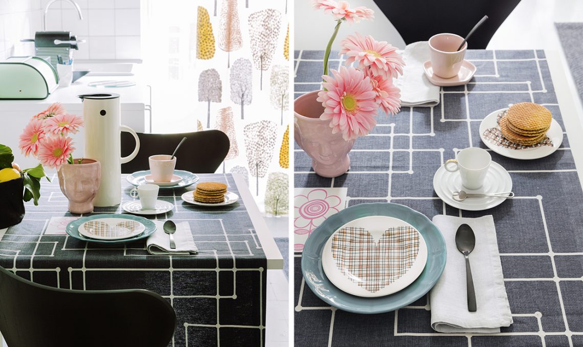 Tovaglia con tessuto Connect Midnight [Kirkby Design]; vaso [Waiting for the bus], tazzina bianca con cucchiaino [Nespresso] e rosa con piattino [Iittala]. Piatti [Croff e Jannelli & Volpi con cuore]. Tovaglioli [Marina C.], cucchiaino [Søstrene Grene].