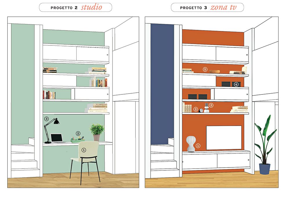 Gli azzurri sono diversi, ma in nuance, e tornano in tutta la casa: sulla parete della cucina con la nicchia in muratura, sulla parete con la tv che si apre sullo studio e sulla zona notte, sulle pareti della stanza e dello studio.