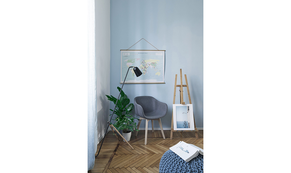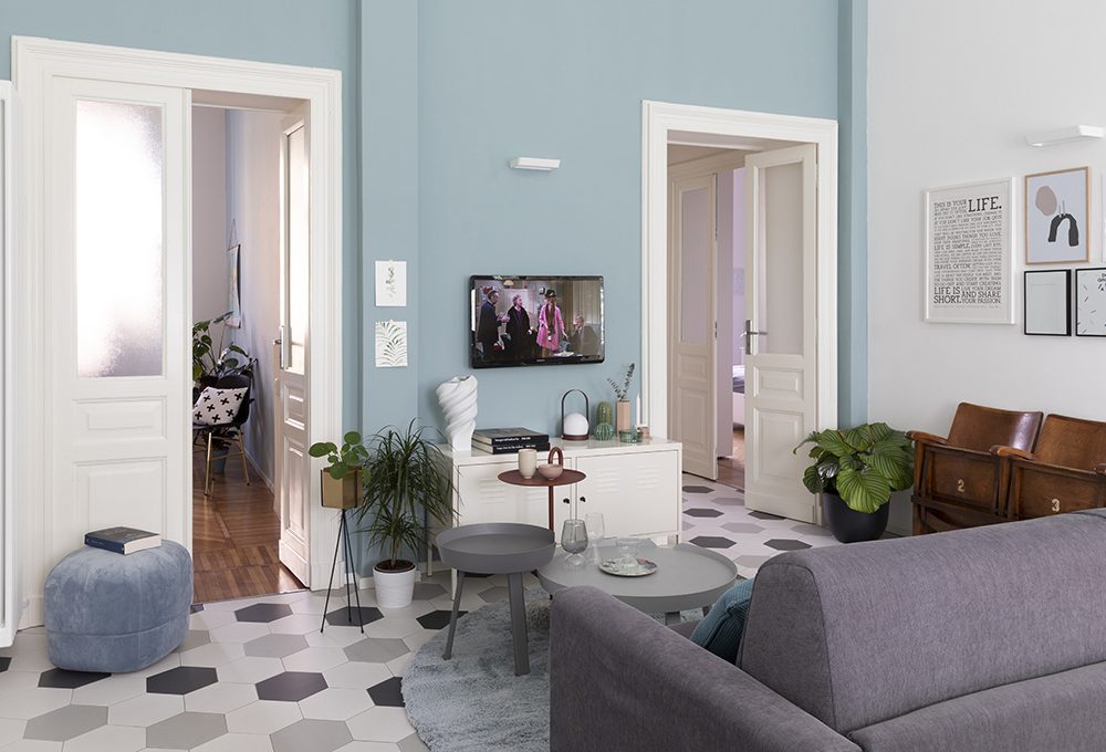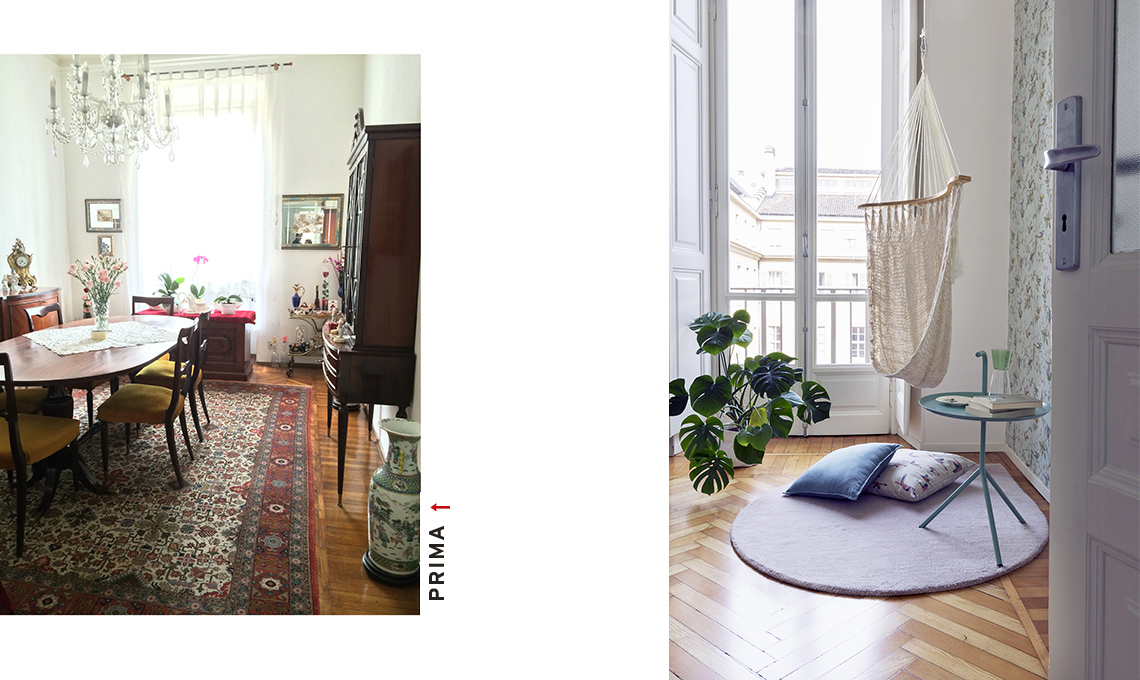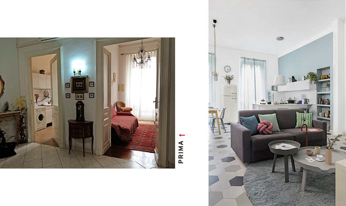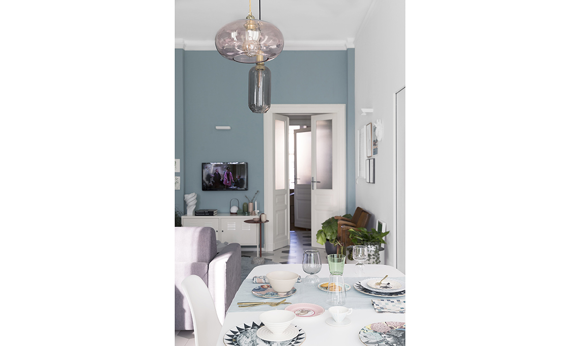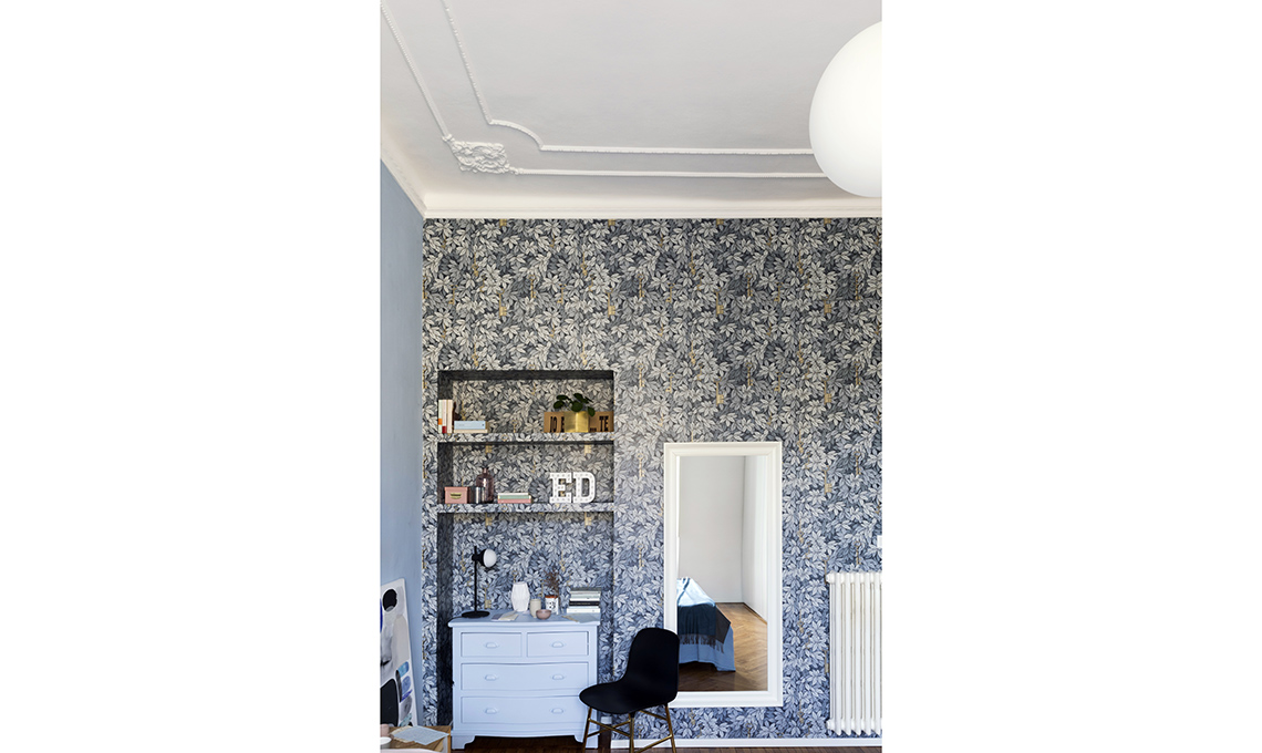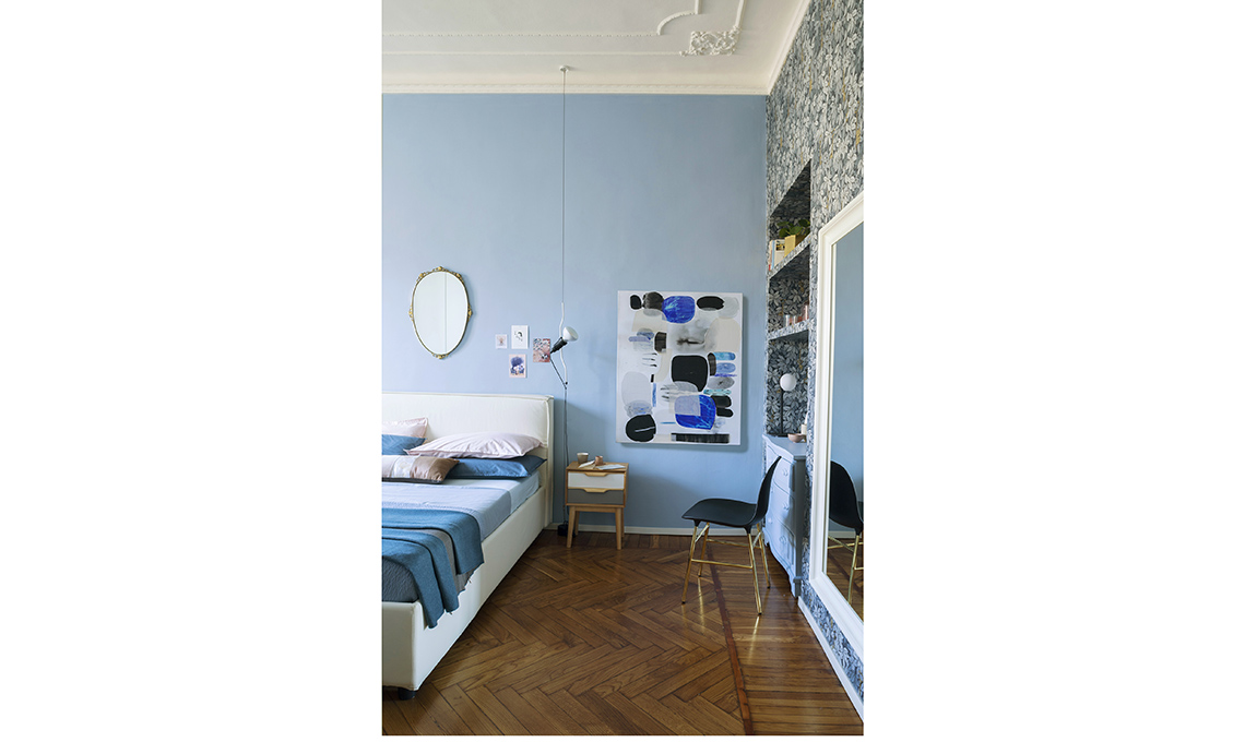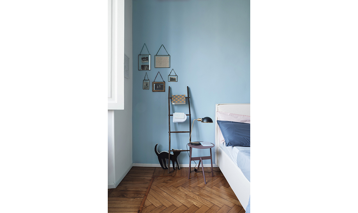 La nostra stylist Elisabetta Viganò ha privilegiato i toni dell’azzurro polvere/acqua, perfetti con gli stucchi originali a soffitto (nelle stanze dove sono stati tolti o danneggiati sono stati ricreati in stile), con le piastrelle effetto cementine ma in versione moderna e con il parquet originale a spina di pesce. Azzeccato il mix degli arredi, con alcuni pezzi vintage abbinati a mobili di design nordico. E i tavolini sono passepartout che girano nelle stanze, a seconda dell’occasione e della necessità. Nella camera, lunga e stretta, è stata tappezzata non la parete con il letto ma quella d’ingresso con la nicchia, in modo da riequilibrare gli spazi.