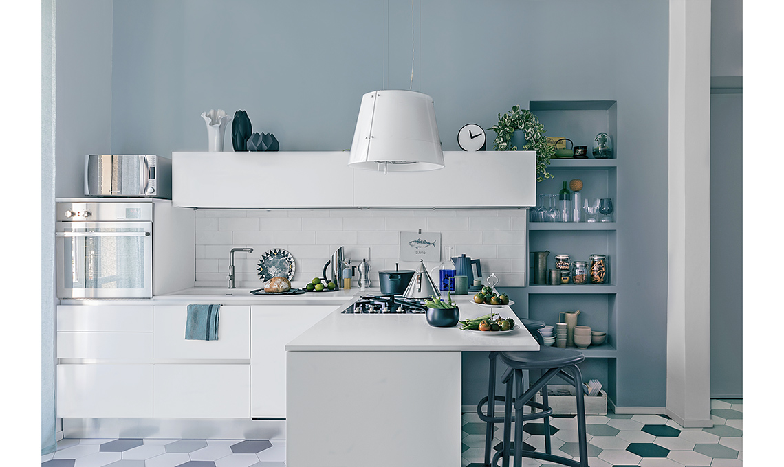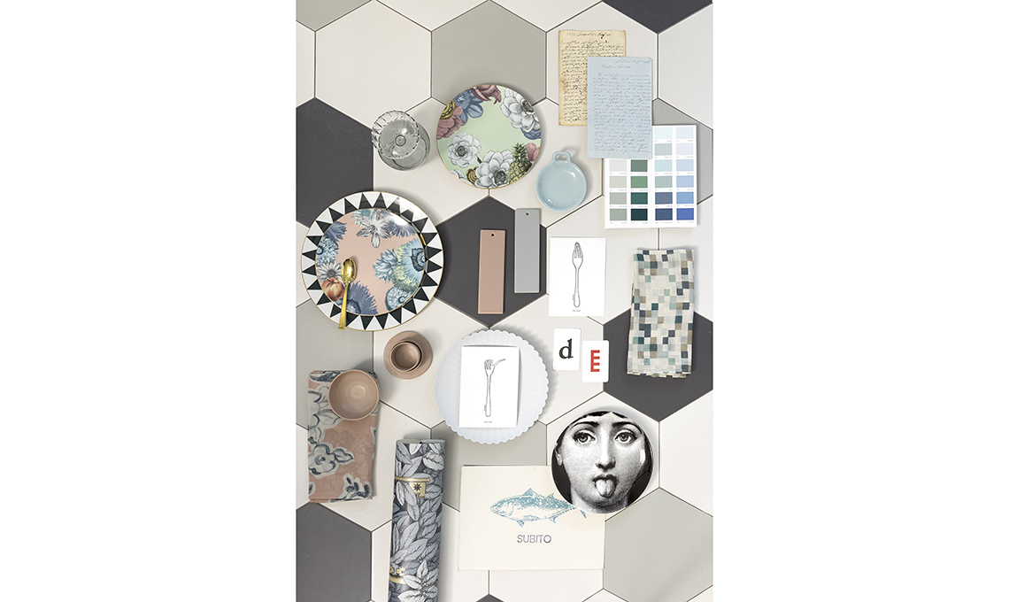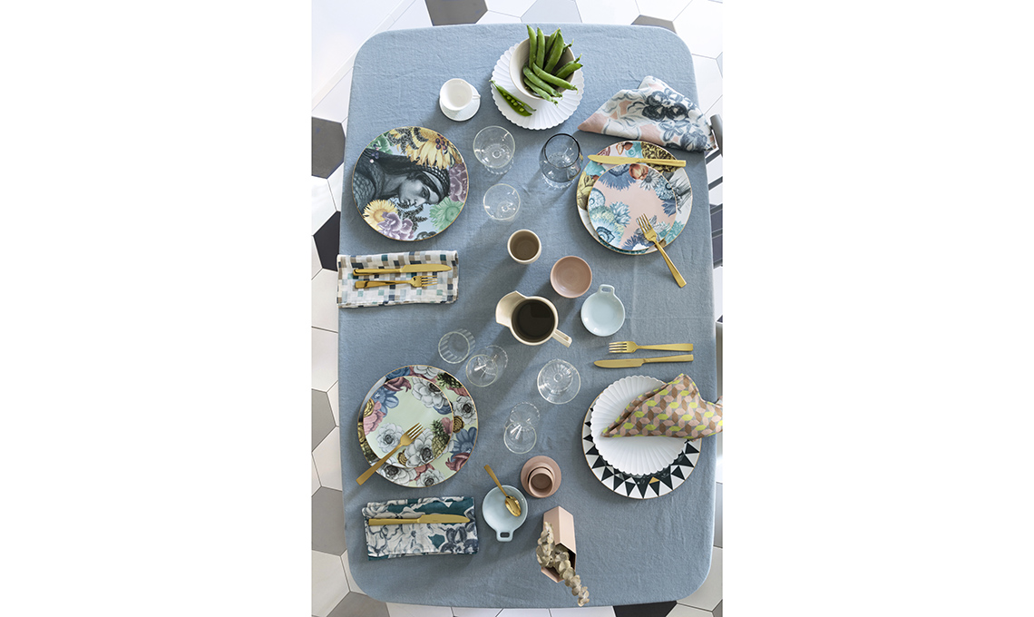 Tovaglia e tovaglioli [Society Limonta], piatti Cairo e Casquette [Grand Tour by Vito Nesta], bianchi smerlati e azzurri [da Tenoha]; tazza, caraffa, ciotole, tazzine e piattini [Martina Geroni], bicchieri [Ichendorf] e posate [Sambonet]. frigorifero [Smeg].