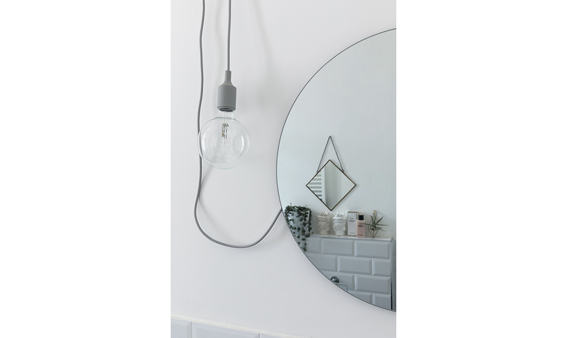 Appoggiato alla parete dipinta con pittura Ariel [Wilson & Morris], mobile Ikea PS in acciaio verniciato bianco [Ikea, cm 119x40x63h € 85] con vaso Squall in porcellana bianca [Rosenthal, cm 32h € 295], lampada Carry Led Lamp ricaricabile con cavo usb [Menu da Fulful Design, ø cm 13,5x 24,5h€139],cactus inceramica Själsligt [Ikea] e piante [Yougardener]. pouf Circus Light azzurro [Normann Copenhagen da Fulful Design, ø cm 65x 35h€660],portapiante Hexagon Pot [Ferm Living]; piastrelle Examatt [Tonalite], tappeto rotondo Glamour in colore Cielo [Sitap].