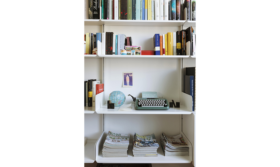 La cucina è completata da piano [Silestone], elettrodomestici [Barazza] e cappa Grace [Elica € 970]. Sopra i pensili, vasi Asym bianco [cm 30h € 179], Core nero [cm 31h € 259] di [Rosenthal] più Folded Vase B grigio [Menu da Fulful Design, ø cm 22x15h € 79,95]; orologio Clork [Puik da Fulful Design, ø cm 19 € 50] e pianta [Yougardener]. Sul top, caraffa Tua in acciaio inox, cavatappi Alessandro M, caffettiera Pulcina, tutto di [Alessi], più caraffa Tequila Sunrise [Ichendorf]. Stampa Tonno Subito [Edizioni Precarie].