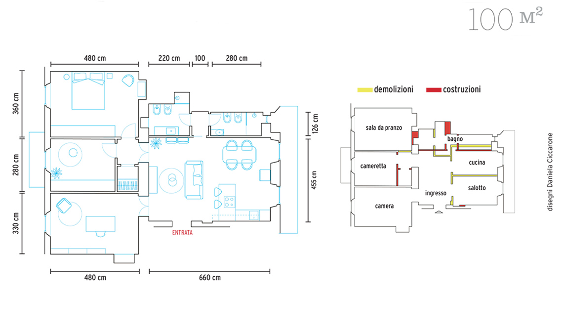 Doppio affaccio, ampia metratura, tanta luce e, soprattutto, soffitti alti decorati con originali cornici in stucco. Per Daisy e Emilio è stato amore a prima vista, nonostante la pessima distribuzione dei locali e alcune finiture vetuste. Decidono di ristrutturare mantenendo 3 stanze (camera, cameretta e studio) da un lato e di rivoluzionare la zona giorno creando un open space.