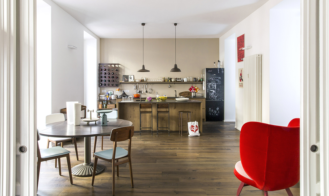 Un maxi ambiente giorno con, al centro, la cucina a vista e una zona notte con bagno 'en suite': così un appartamento di fine '800 viene 'cucito addosso' ai suoi vivacissimi abitanti!