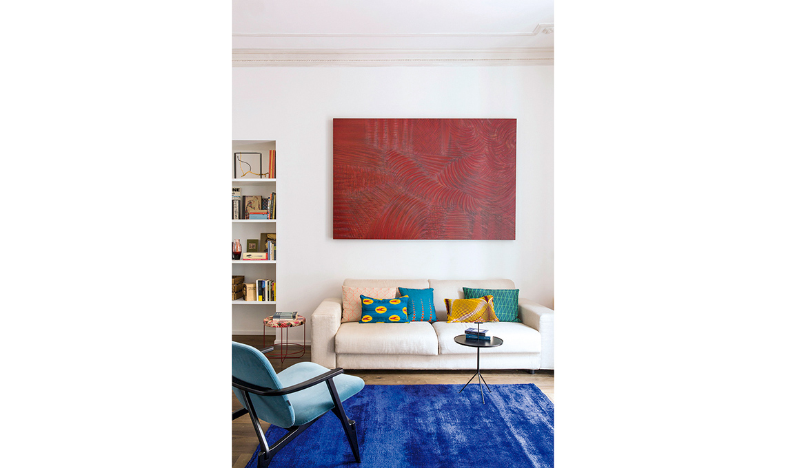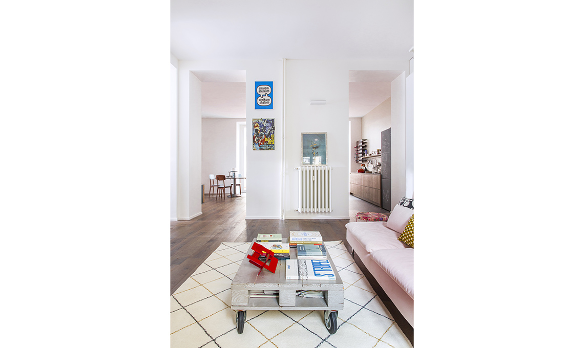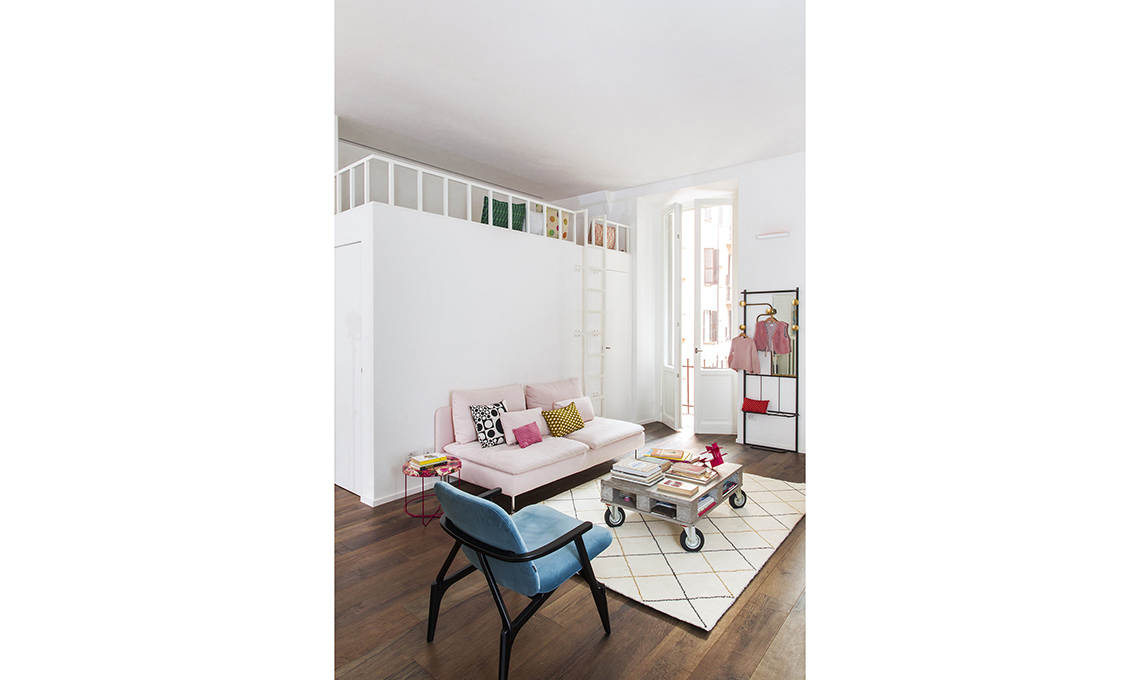 Divano componibile Söderhamn rosa [Ikea, cm 186x99x83h da €390] con cuscini [Vitra €179 e Beddy Baggy Wax]; poltroncina azzurra Louise [Zanotta, cm 66x75x73h €1.818 da Spazio 5 Arredamenti], tappeto Mark [Kasthall, cm 172x245 da €2.145] e stampe [Jean-Marc Dumont-L’endroit]. La scala bianca in ferro del soppalco è stata realizzata su disegno dall’artigiano e artista [Pietro Zucca].
