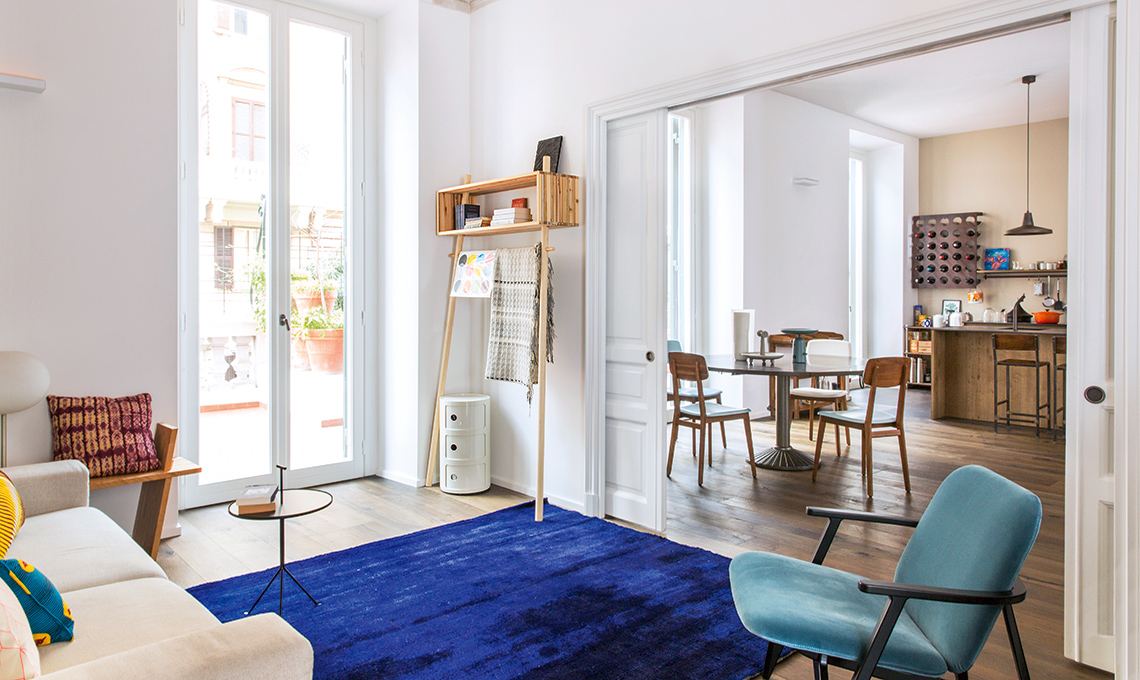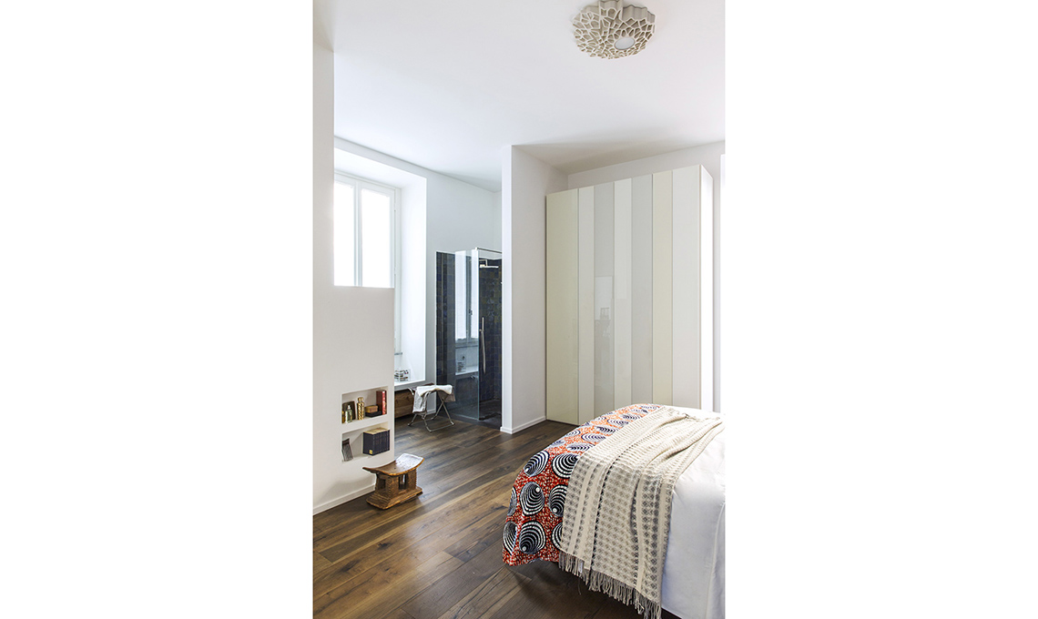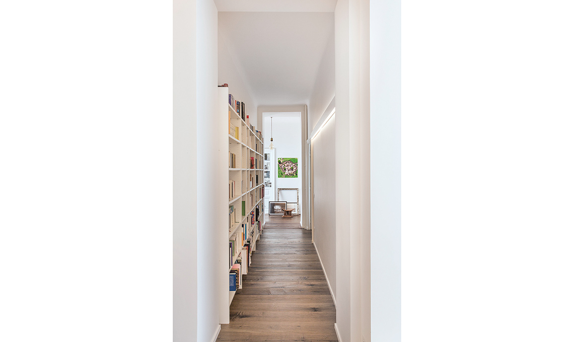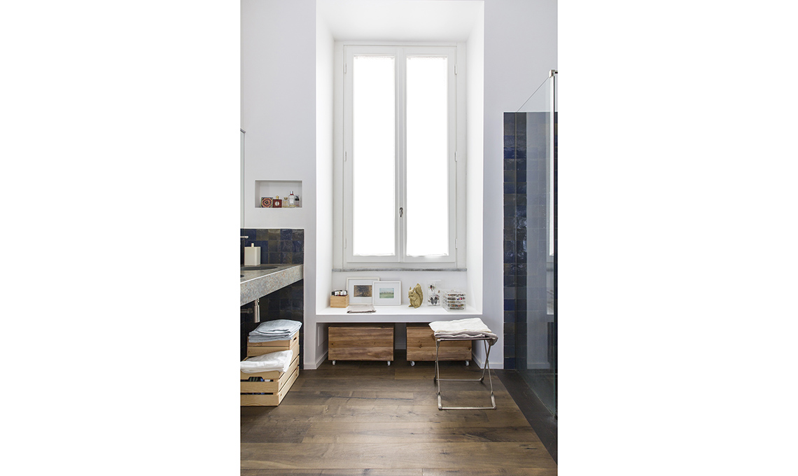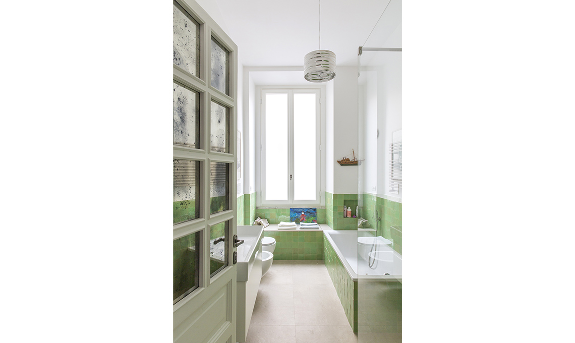 Qui entrano in scena l’architetto Francesca Bertuglia, che ha curato la parte strutturale e di finitura, e la stylist Cristina Gigli che si è occupata di arredo e décor. La sfida più grande? Far convivere la struttura antica con la voglia di contemporaneità. Conservate in parte ed esaltate le cornici del soffitto, restaurate le porte e rifatti i serramenti in stile, tutto il resto è molto moderno e francese: i colori, il parquet a listoni, le piastrelle smaltate, l’accostamento di opere d’arte a pezzi storici del design, la cucina open con quasi tutto a vista.
