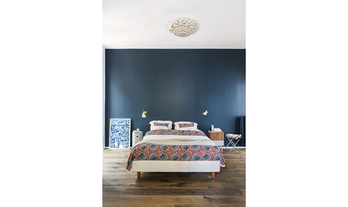 Sul letto a sommier [Simmons], copripiumone e federe [Beddy Baggy Wax]. Sulla parete, smalto color Hague Blue [Farrow & Ball], appliques dal mood vintage [in vendita da Lumières], lampada da soffitto Notredame [Karman], comodino Componibile [Kartell].