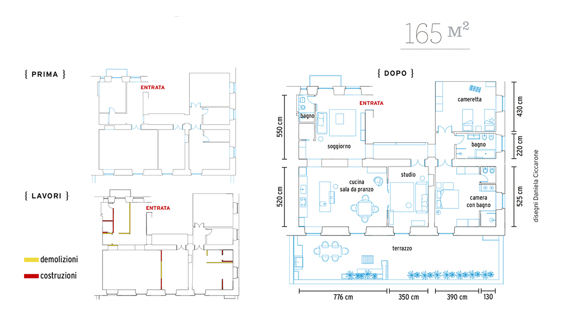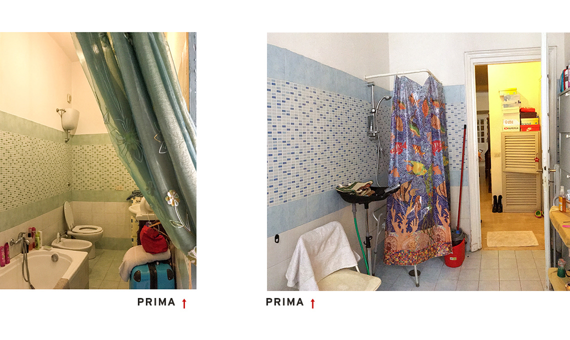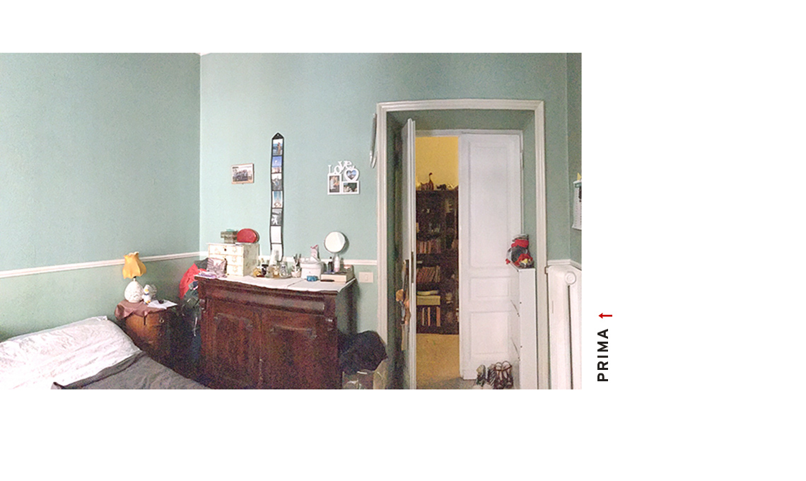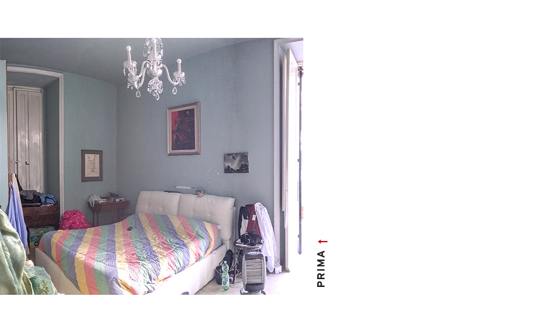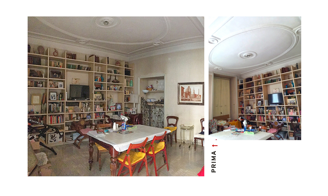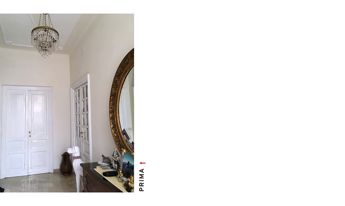 un unico maxi ambiente, i vani delle porte sono stati alzati fino a 20 cm dal soffitto (dato che il muro è portante è stata inserita una putrella in acciaio di rinforzo) e gli infissi e le cornici sono stati eliminati.