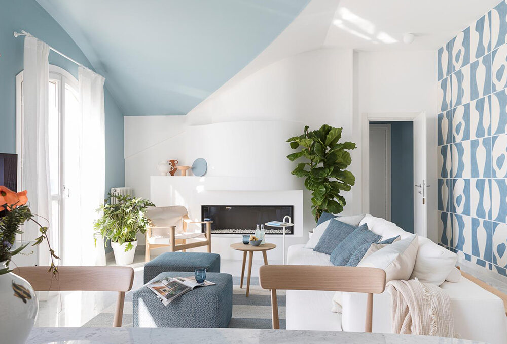 cm 62x80x81h] e tavolino scandi style in legno Nordlys [Maisons du Monde, ø cm 50x37h]. Sul terrazzo, poltrone Acapulco giallo lime [cm 71x100x87h] e sgabello Centro coordinato [Ok Design, ø cm 47x42h]. A terra, parquet Proline Rovere terra piallato tabacco verniciato e posato a correre [Piana].