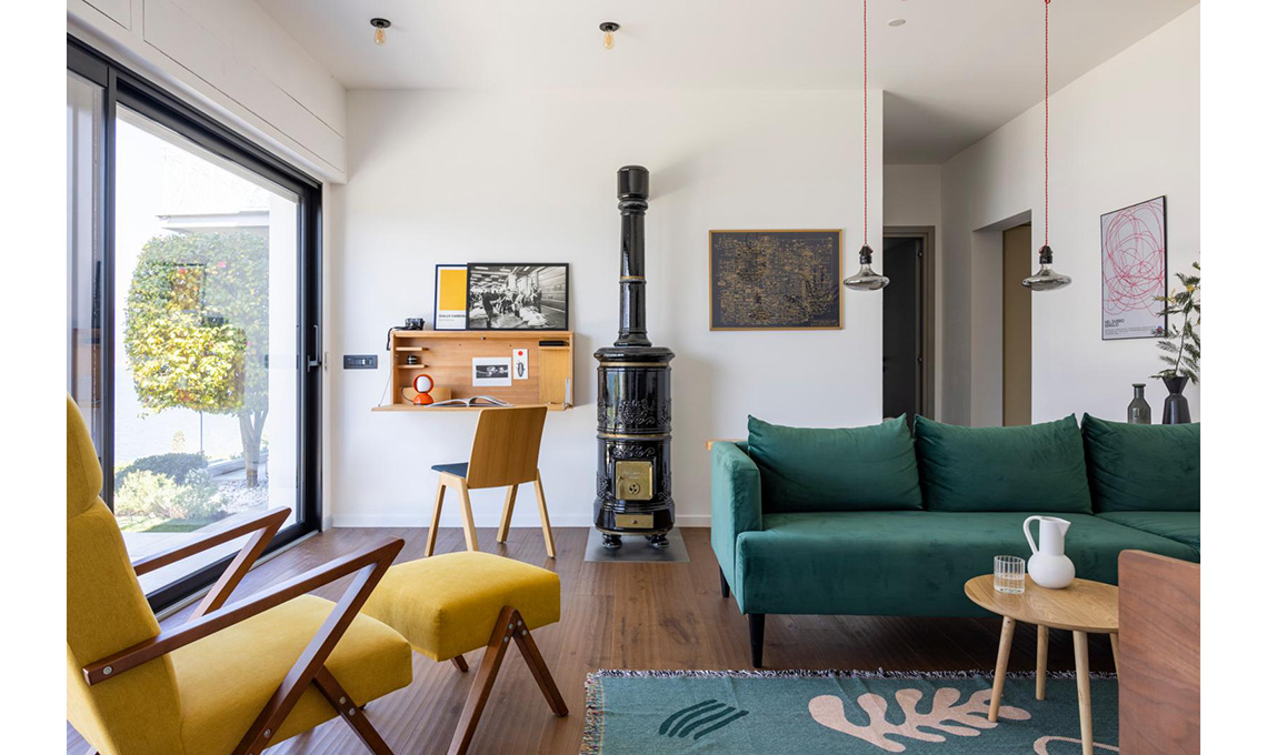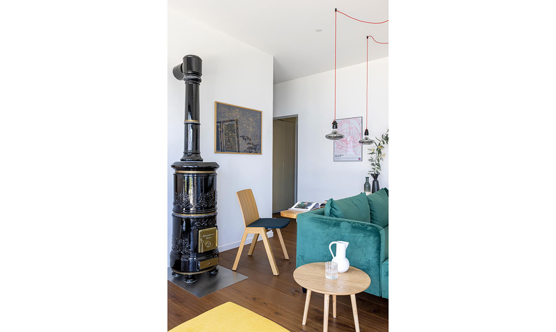 Nel living, Antonio ha voluto mettere tanto di sé: dalla stufa in ghisa e ceramica, acquistata dai suoi negli Anni ’80, allo scrittoio in stile nordico da lui stesso disegnato, alla poltrona dal mood vintage, fino alle sospensioni che ha creato con le sue mani.