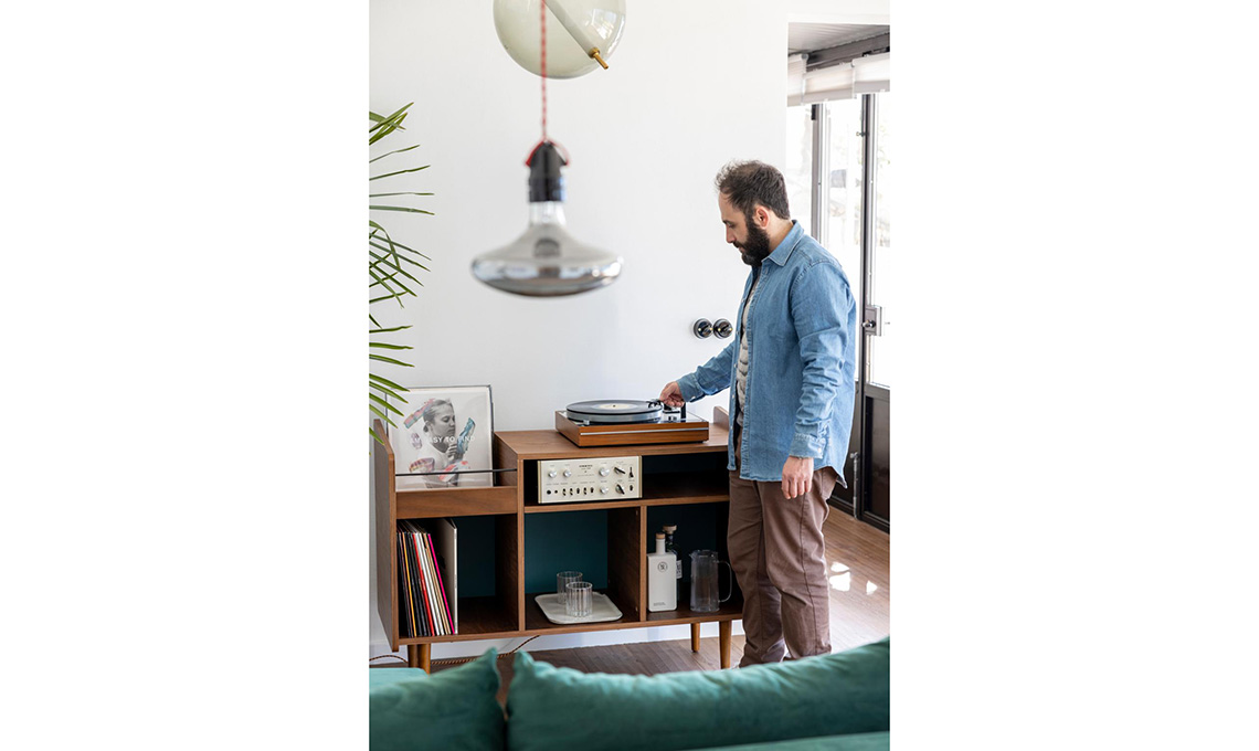 Antonio usa questa casa ogni volta che torna in Italia per brevi vacanze, quindi ha voluto che l’insieme risultasse decisamente rilassante. Pezzo importante del soggiorno è il mobile che ospita l’impianto hi-fi e parte della sua collezione di vinili.