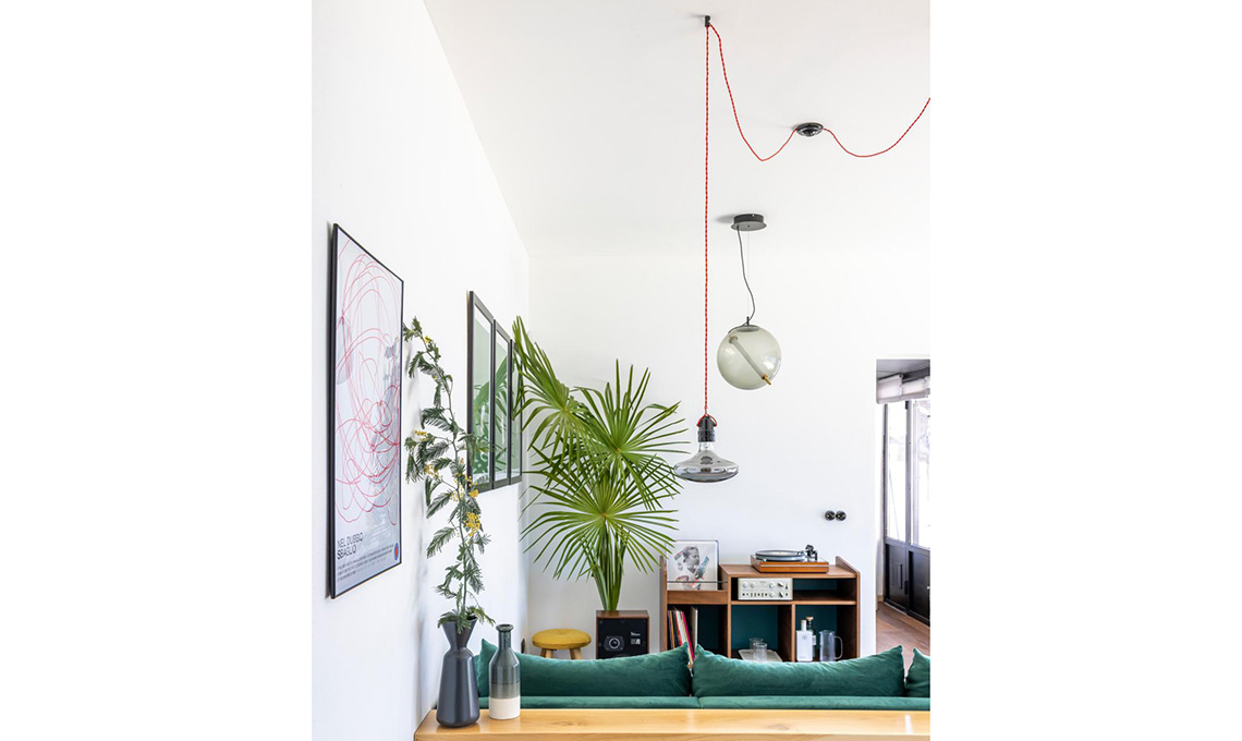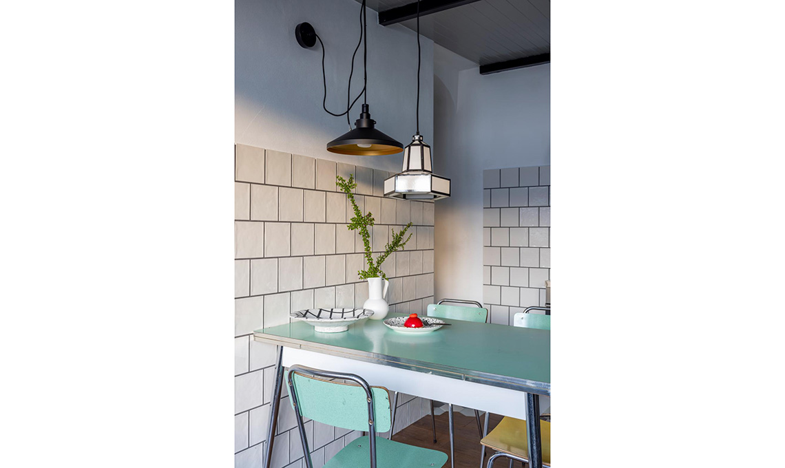 Tavolo e sedie vintage acquistate in un negozio di modernariato, sospensione Cut ’n Paste in cartone riciclato e resina epossidica [Seletti, ø cm 26x24,2h], centrotavola Grid [Serax].