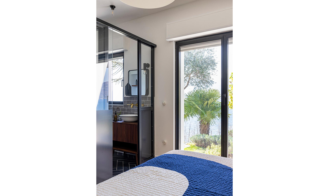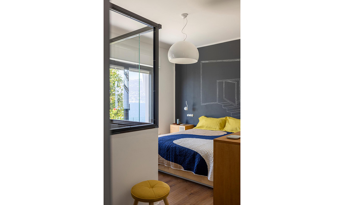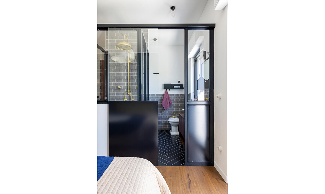 Dove c’era la cameretta, tra la stanza padronale e il soggiorno, è stata ricavata la stanza matrimoniale di Antonio. Accorpando anche lo spazio del bagno adiacente si è creata una vera suite con servizio privato, e pareti in ferro e vetro nella parte alta.