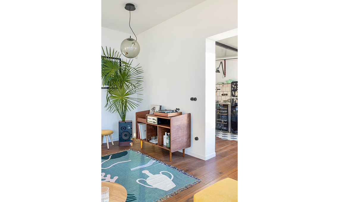Tappeto Mirage azzurro con decori stilizzati [Ferm Living, cm 120x170], mobile porta-impianto hi-fi e vinili Ronda in noce [La Redoute, cm 114x 48x81,5h], sgabellino giallo [Leroy Merlin].