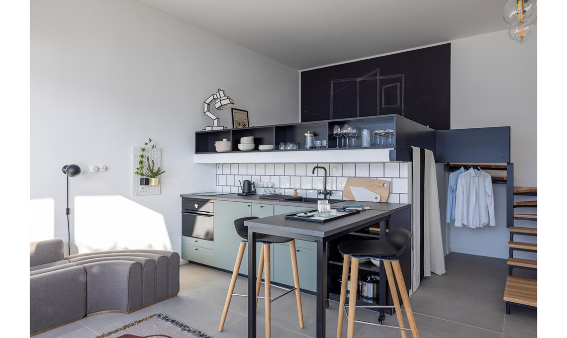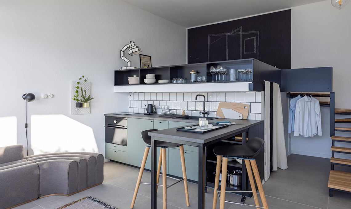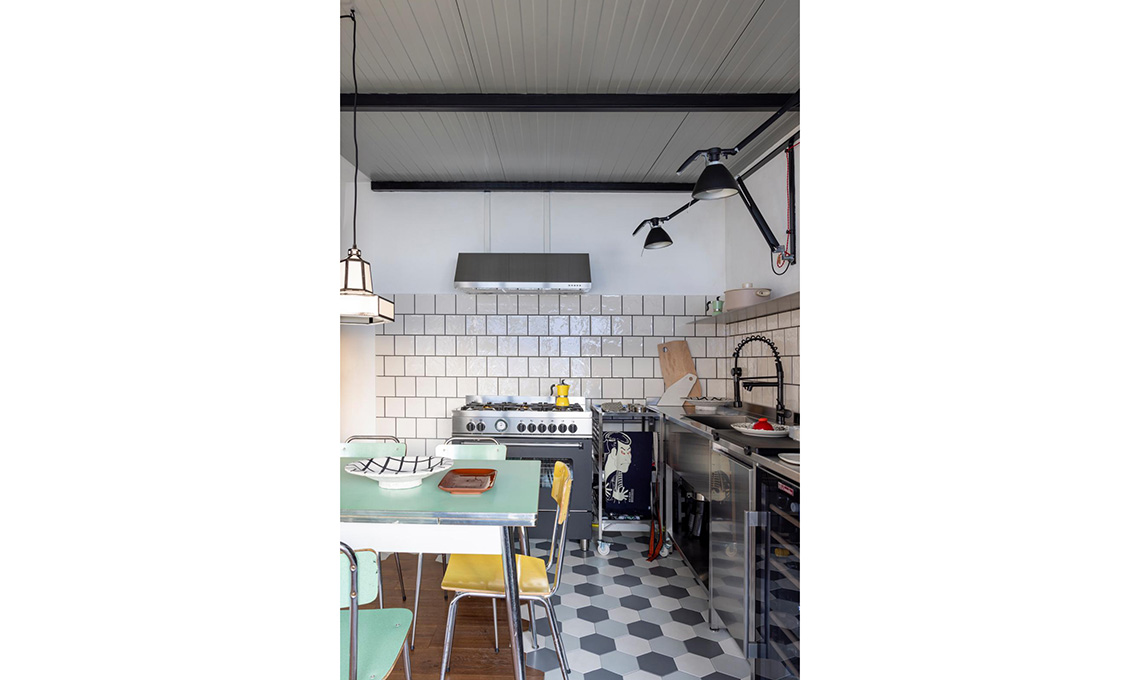Cucina Bodarp grigia e verde [Ikea], penisola realizzata su disegno di Antonio, sgabelli bar Pola Low in rovere e polipropilene [Crassevig, cm 52x56x73h]. Vassoio sulla penisola [Serax], lampada da tavolo sul soppalco Cut ’n Paste [Seletti, cm 30x40x58h]. Piastrelle a pavimento in grès District Boulevard [Lea Ceramiche, cm 90x90] e a parete Silk Pergamena [Tonalite, cm 15x15].