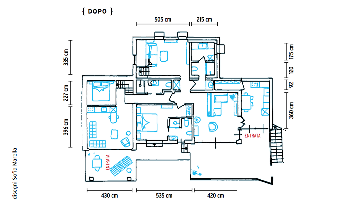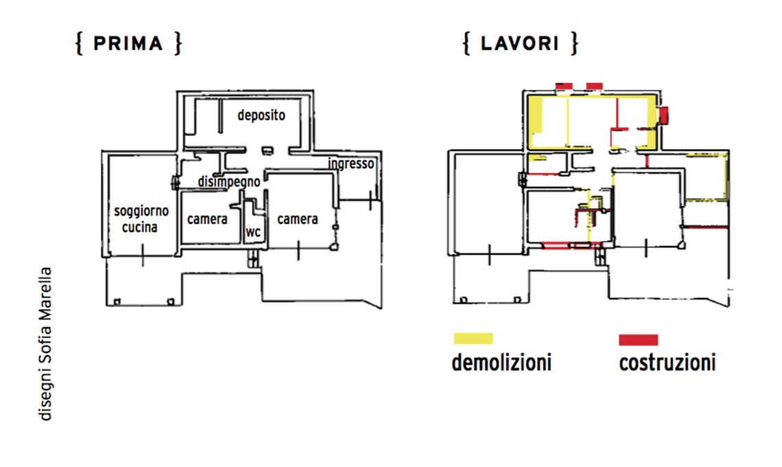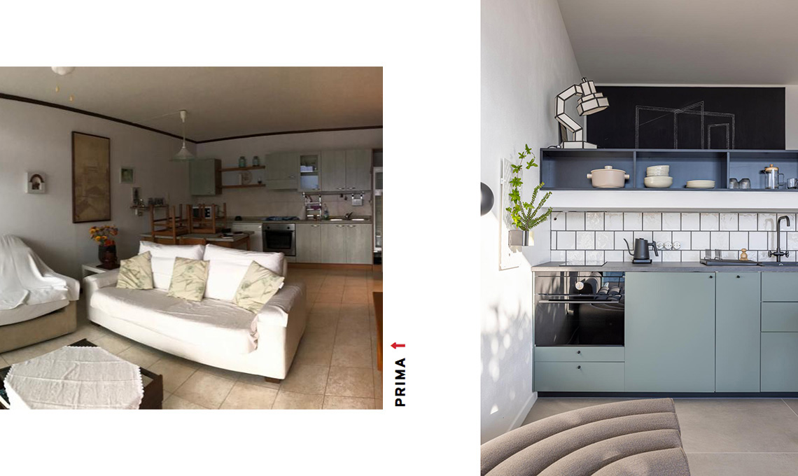 «L’appartamento era grande: ho pensato di dividerlo in due parti autonome ma comunicanti» racconta Antonio. «Quando sono solo posso stare nel trilocale senza dover accendere gli impianti di tutta la casa. E se ci sono ospiti, posso garantire loro privacy nel monolocale». Così, dove prima c’era il soggiorno è stato realizzato un ambiente giorno/notte con cucina a vista e un soppalco che sopra ha il letto e sotto una cabina armadio. Ma il lavoro grosso è stato fatto nella casa più grande: quello che era un locale di accesso è stato ampliato e trasformato in cucina, una delle due camere in soggiorno e la parte retrostante, totalmente risanata, è diventata una sala hobby con lavanderia. Gli accessi sono dal terrazzo.