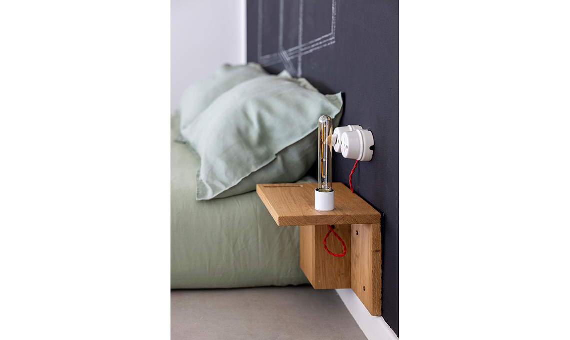 per ricarica cellulare, realizzati su disegno di Antonio e Yulia [Falegnameria Ranzoni], sospensioni Igloo [Rossini Illuminazione].