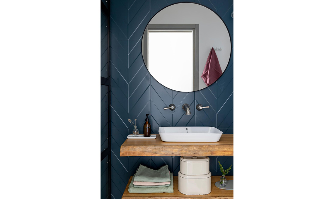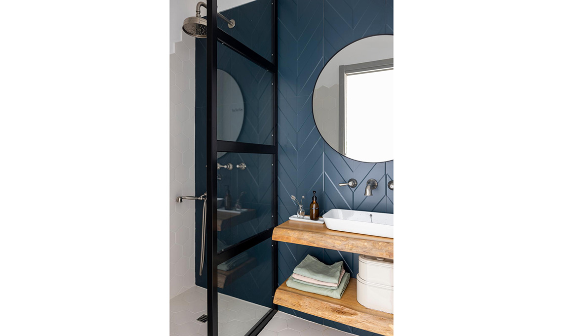 Piastrelle a parete Chevron Blue Matt [Marca Corona, cm 40x 80] e a terra Hydraulicart B&W Floreal 2 [Valmori, cm 20x20].