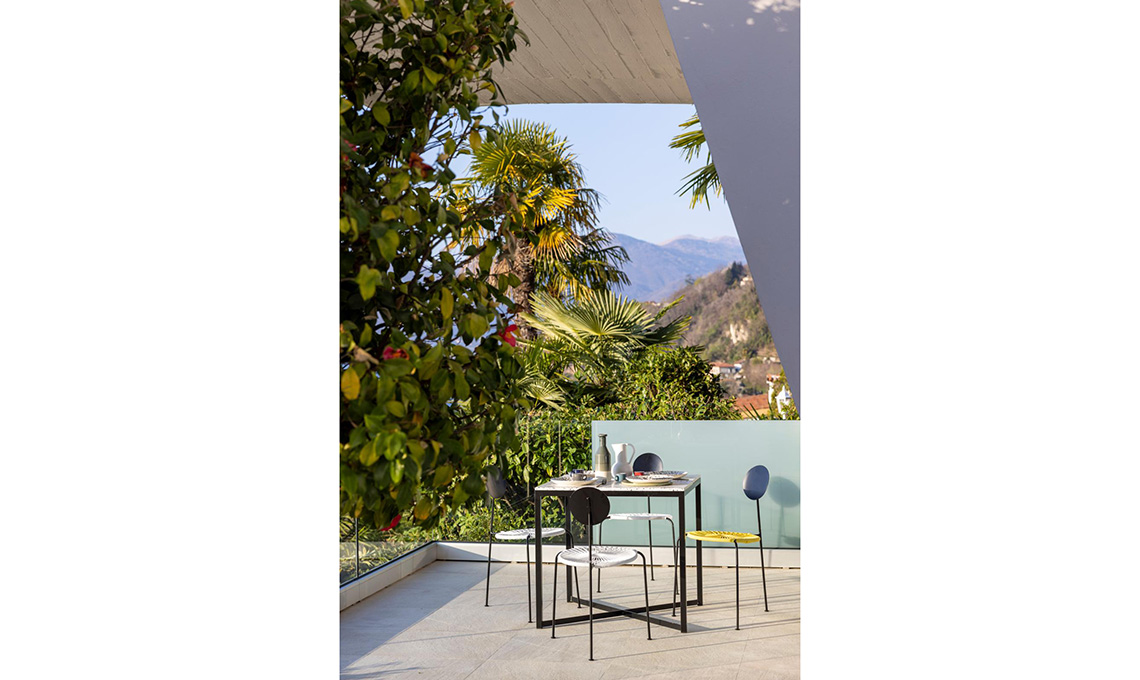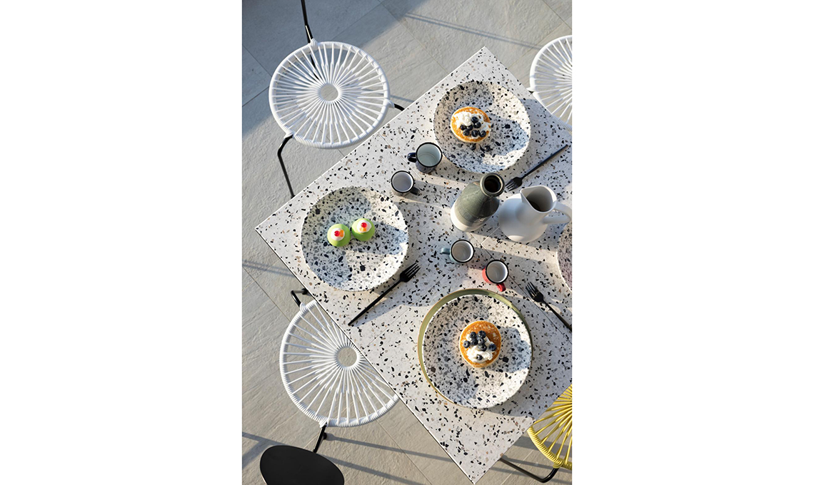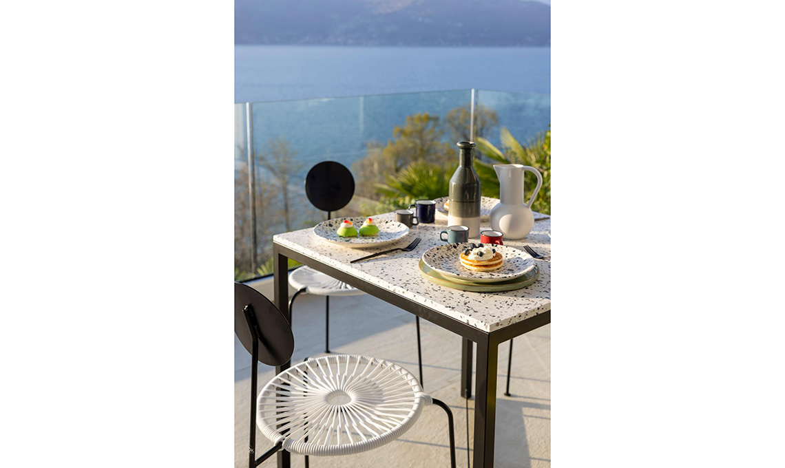 Il tavolo scelto per la zona pranzo outdoor, nella sua semplicità, ha ispirato anche l’apparecchiatura, realizzata con piatti dal decoro ‘terrazzo’ accompagnati da posate nere, tazzine grigie e mattone.