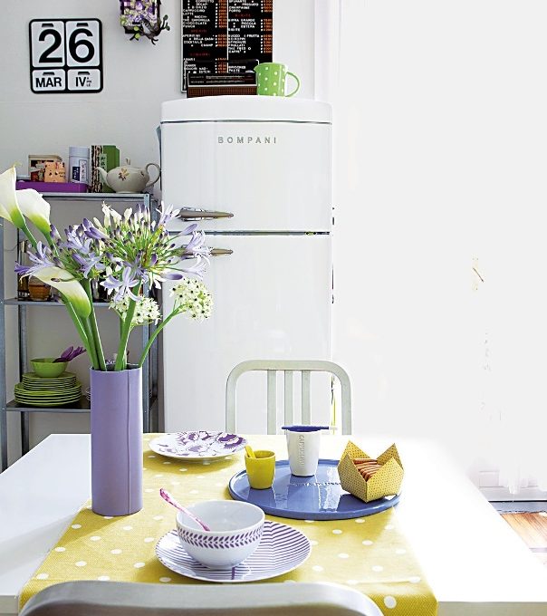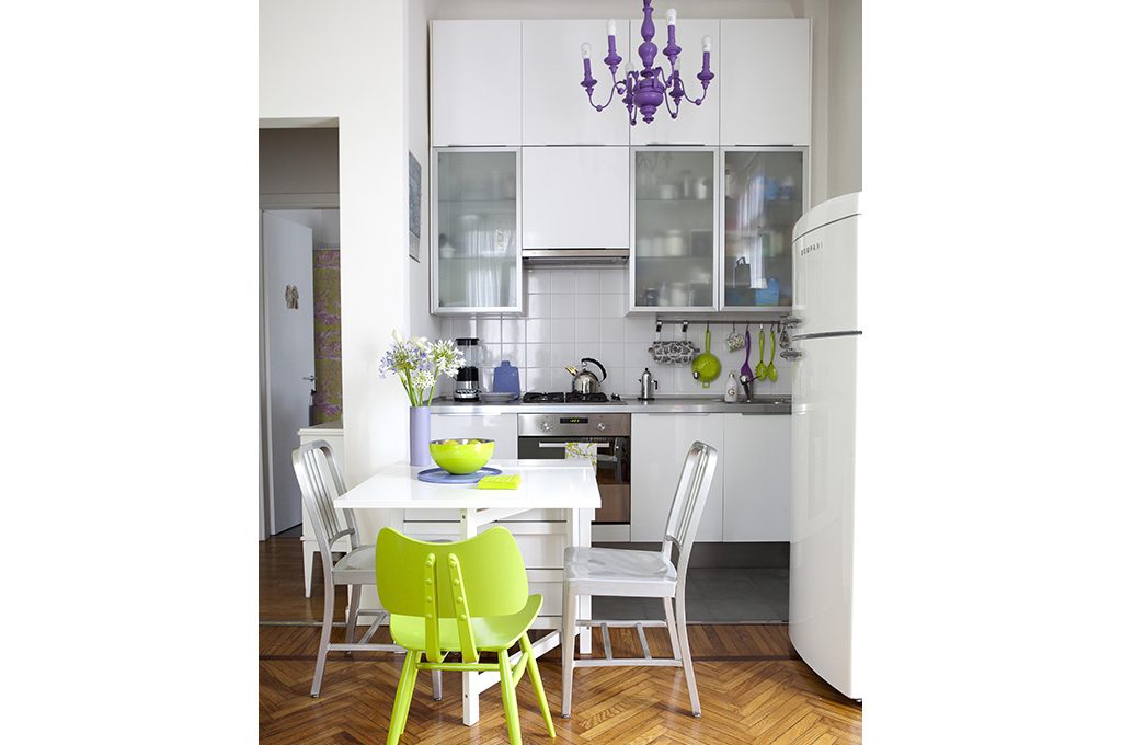 La cucina è in una nicchia aperta sul soggiorno, di cm 232x125. I mobili bianchi, con ante laccate o a vetri, e top inox, sono Abstrakt di Ikea, con doppi pensili sovrapposti per sfruttare l'altezza. Il tavolo-consolle in legno bianco con doppio piano a ribalta è Norden (Ikea, cm 26/89/ 152x80x74h, €150,24). Sedia in alluminio (Emeco, €99 cad); sedia in legno laccata verde (da La Rinascente Design Supermarket, €495). Sui fuochi, bollitore 9091 di Richard Sapper (€170) e, accanto, caffettiera La Cupola di Aldo Rossi (€58), entrambi di Officina Alessi. Sul tavolo: vaso La Rinascente Design Supermarket; vassoio in ceramica viola (da JV Store); ciotola in acciaio verde Steel (Zak! Designs €48,30). Il frigorifero Rétro è bombato, a doppia porta (Bompani, cm 60,5x 63,5x175h, €835 circa).