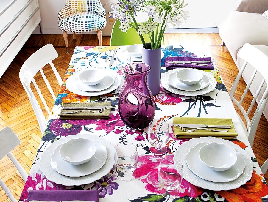 A centro stanza Il tavolo Norden completamente aperto (Ikea, cm 152x80x74h, €150,24) accoglie comodamente 6 persone. Quando ha visto il tessuto in 100% lino a stampa digitale Amrapali (Designers Guild, cm 140h, €113/m) per Antonella è stato innamoramento a prima vista: detto fatto, ecco una tovaglia! Piatti in porcellana bianca con decoro a rilievo Dressed, design Marcel Wanders (Alessi, piatto piano €22, dessert €16, coppetta €14,99); posate Caccia (Alessi, set 5 pz €55) e calici da vino Dressed (Alessi, €20 cad). Brocca in vetro color prugna Milo (Lsa International, €76); vaso in ceramica lilla (La Rinascente Design Supermarket €135); sedie bianche Giuseppina (Bonaldo €170 cad). Poltroncina multicolore Inkchair, collezione Ooh La Laa & Co Design.