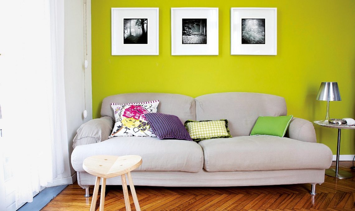 Lo stesso verde acido dell’ingresso è ripetuto sulla parete più lunga del soggiorno: per dare continuità alla zona giorno open, per regalare una sferzata di gioiosa energia e per fare da sfondo al comodo anche se super-collaudato divano grigio chiaro. La porta che divideva il soggiorno dal corridoio-ingresso è stata eliminata.